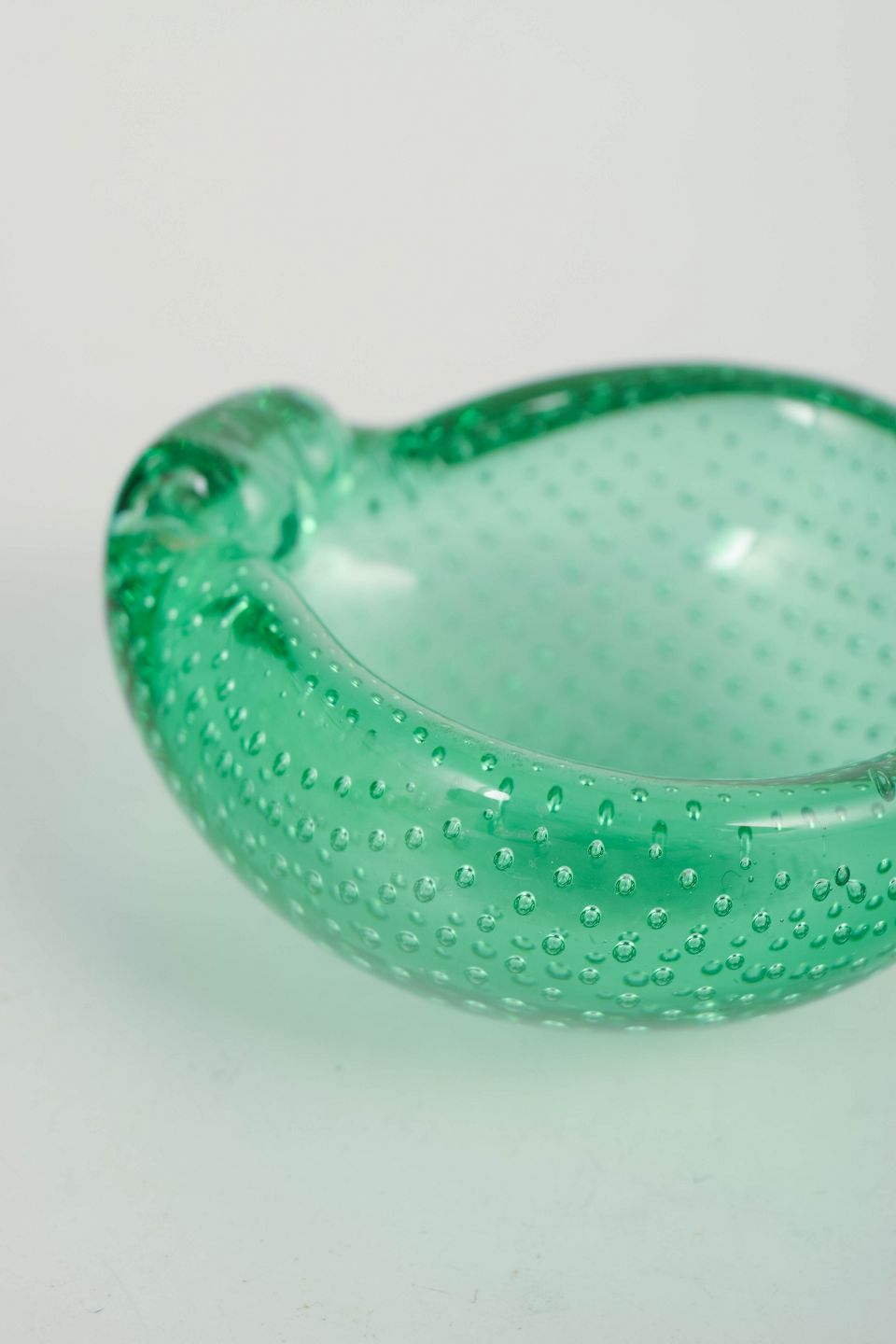 Organically shaped small bowl in green art glass with controlled bubbles and a textured “dotted” surface, retaining the original “Made in Murano Italy” label.