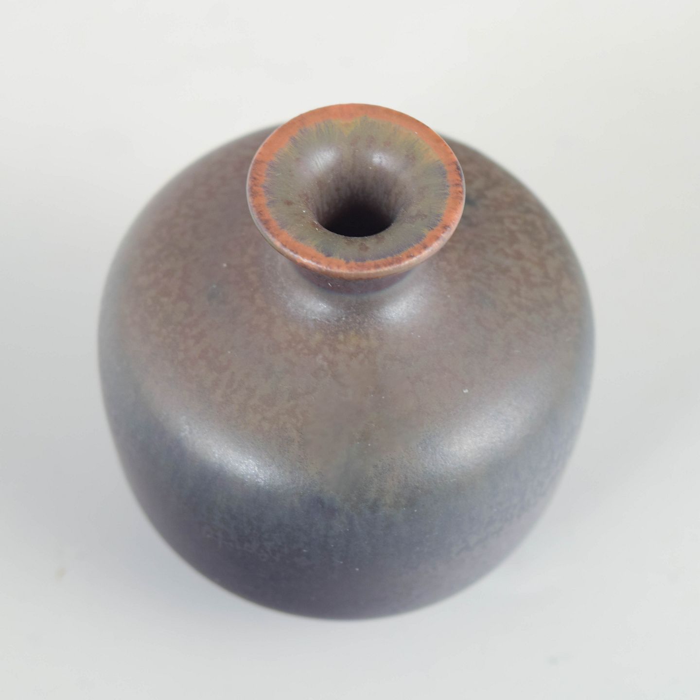 Compact miniature vase in thrown stoneware with rounded body and narrow neck, finished with a finely speckled matte glaze in dark grey-brown tones. Model 559, first quality.
