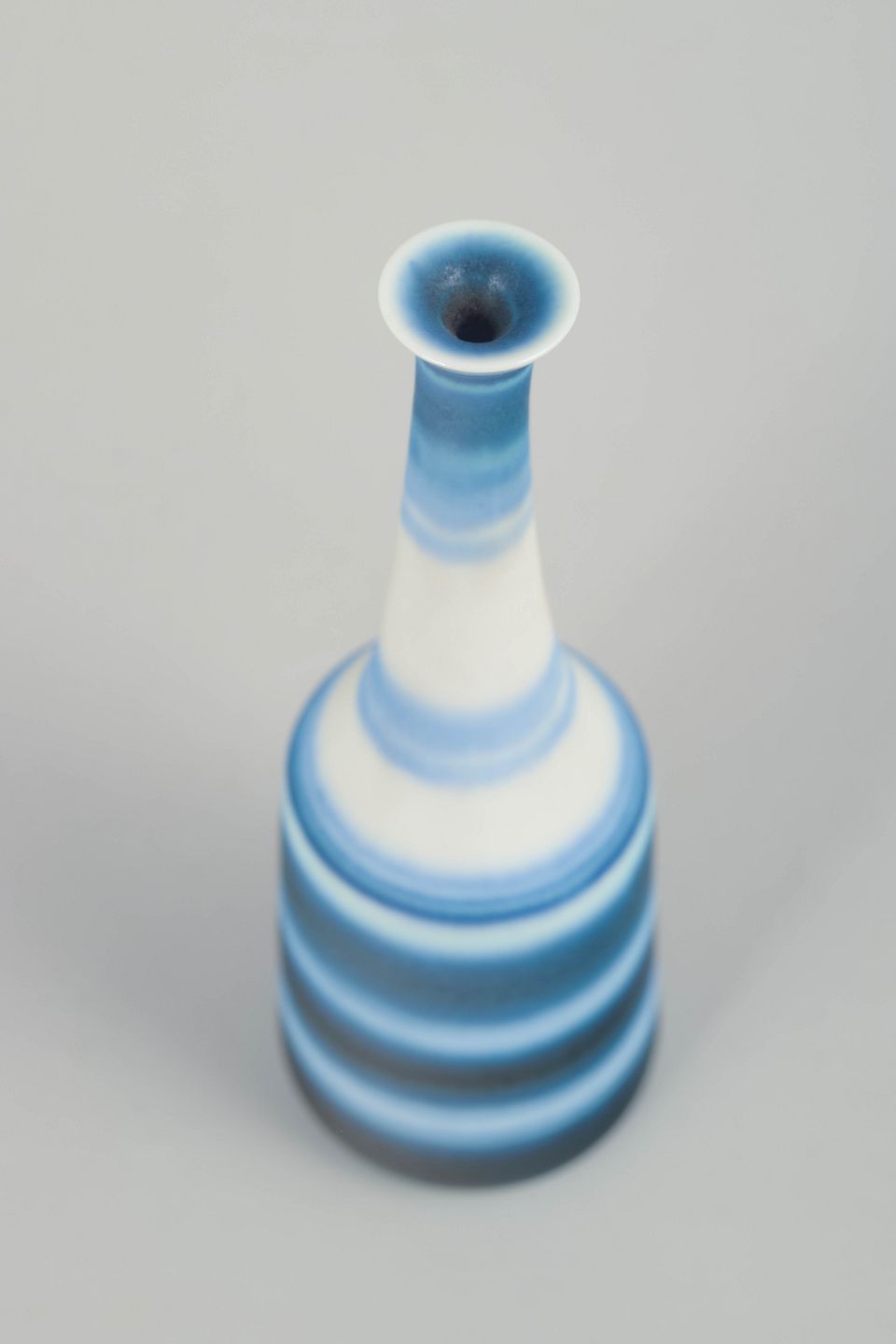 Slender miniature vase in thrown stoneware with horizontal bands in blue and white tones, executed in Nylund’s characteristic glaze work.