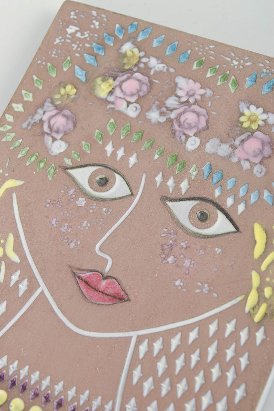 Rectangular figurative wall relief model 5050 M featuring a stylised female portrait decorated with flowers and geometric ornaments in relief and coloured glaze.