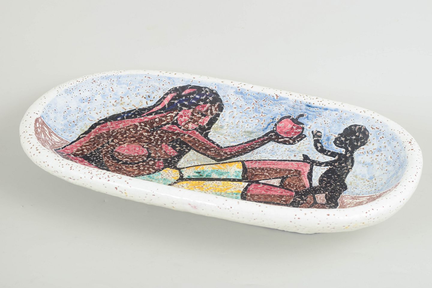 Unique figurative wall relief in glazed stoneware with a stylised mother and child motif rendered in strong earthy colours and contrasting outlines.