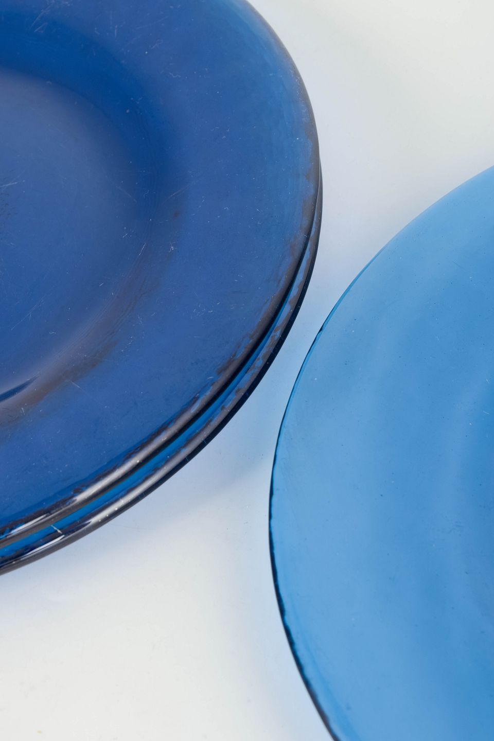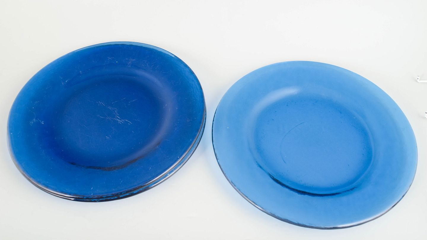 Set of three Swedish plates in heavy blown art glass in blue tones, with a smooth centre and slightly irregular rim, characteristic of Scandinavian glass design from the mid-20th century.