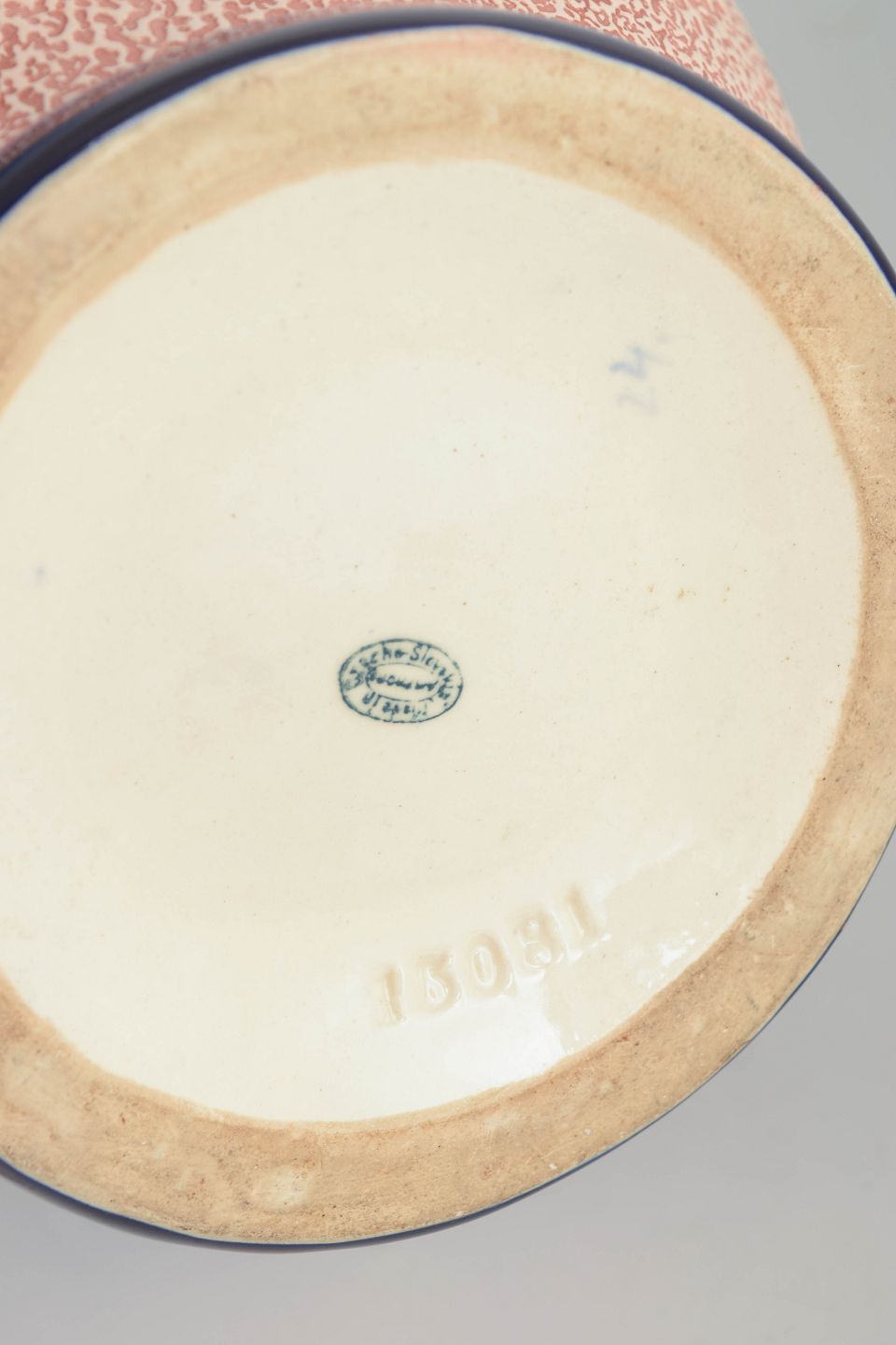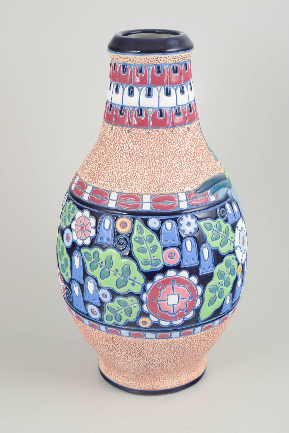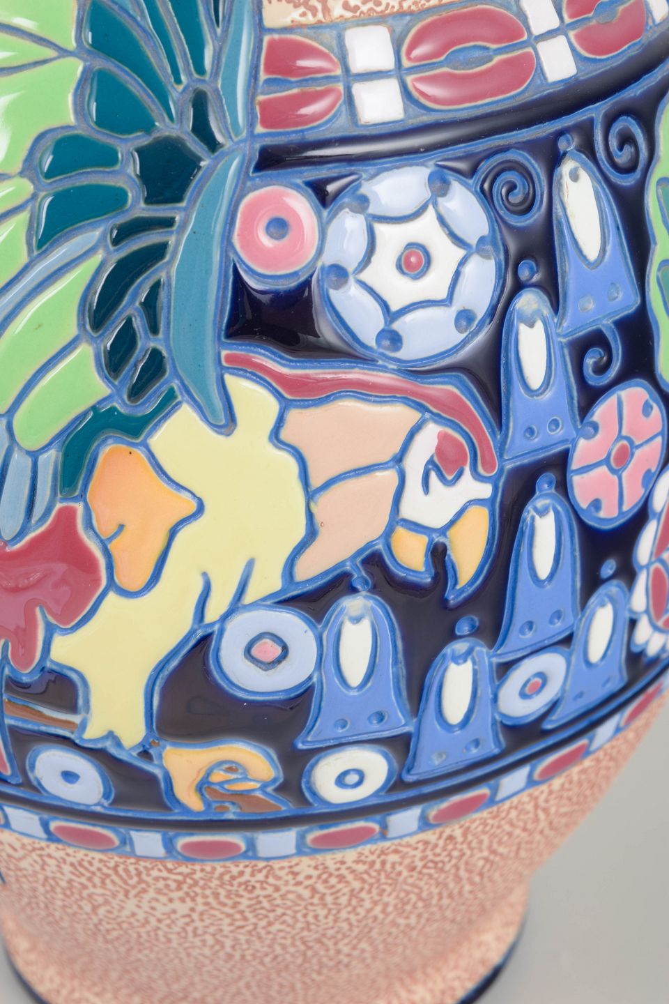 Czechoslovakian art ceramics of the 1930s were often characterised by a synthesis of Art Deco and folk-inspired ornamentation, combining stylised animal and plant motifs with geometric patterning in vivid colours. Enamel decoration allowed for strong contrasts and saturated hues, and large Amphora vases such as this were conceived as striking interior features in contemporary middle-class homes.