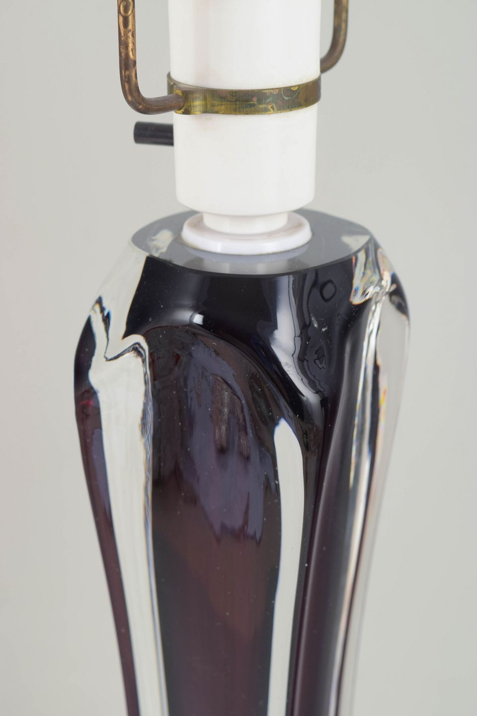 Pair of table lamps in purple art glass with tall faceted bodies and a clear base.