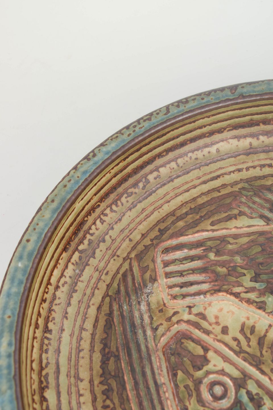 Large circular stoneware dish with glazed surface and a central stylised fish motif in earthy tones, combined with contrasting glaze bands. Model 21937.