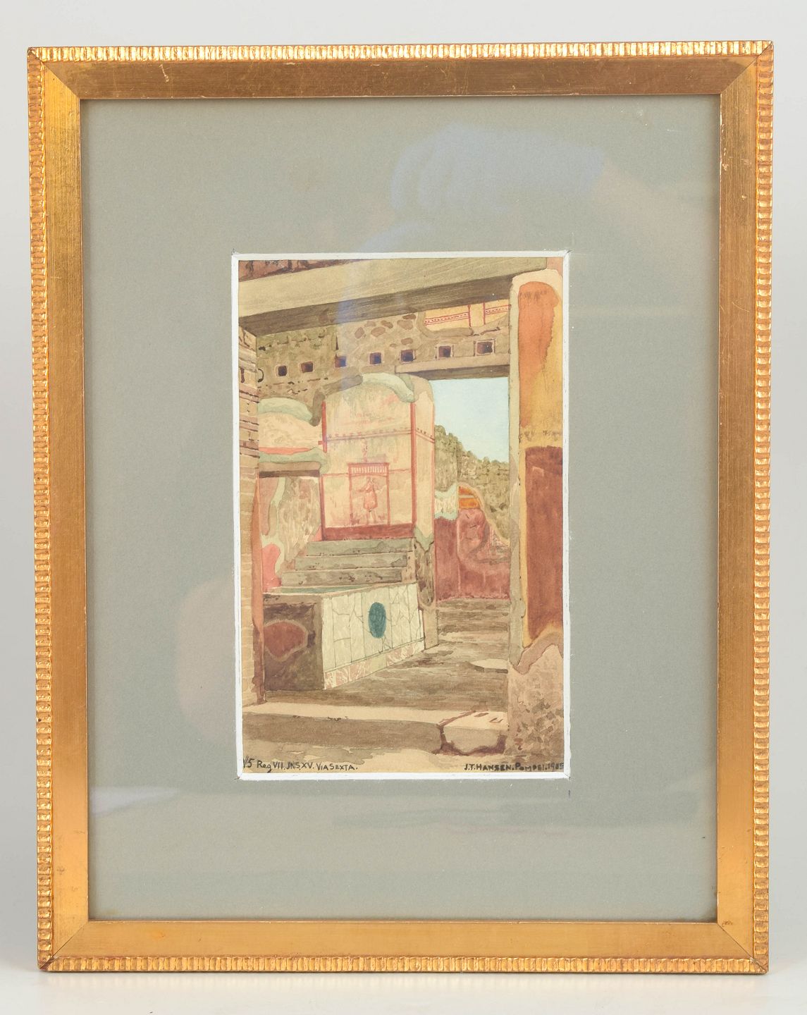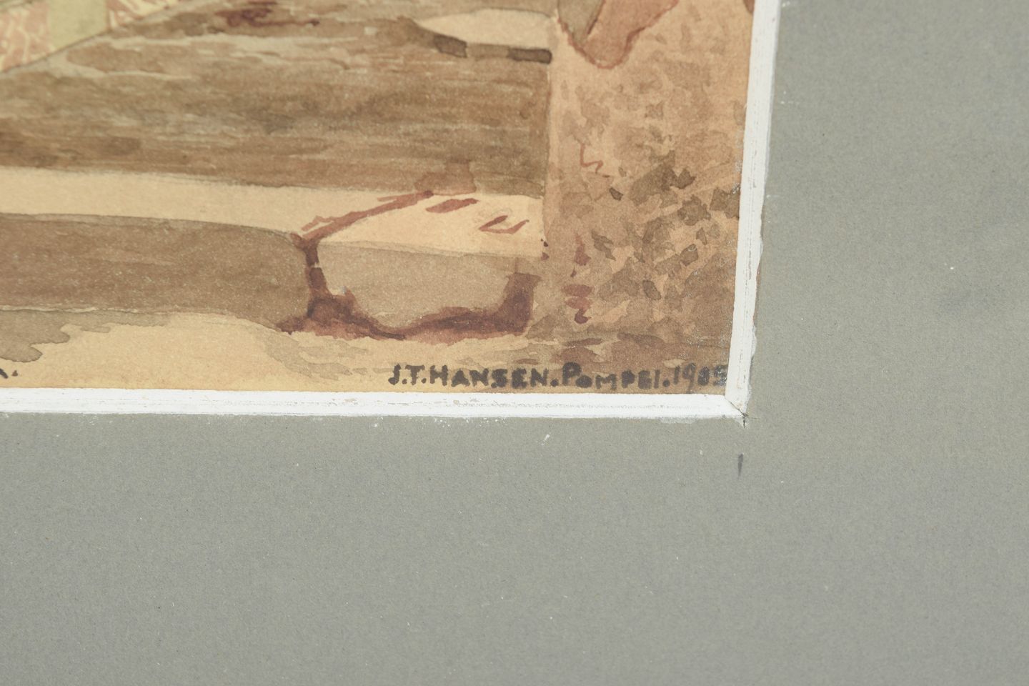 Architectural view from Pompeii with classical building fragments and spatial perspective, executed as a watercolour in muted earth tones and warm ochres. Signed and dated Pompeii 1905.