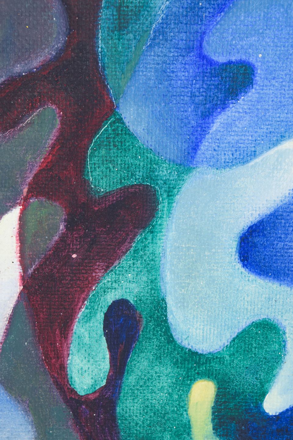 Abstract painting with organic, flowing forms and overlapping colour fields executed in oil on board, signed.