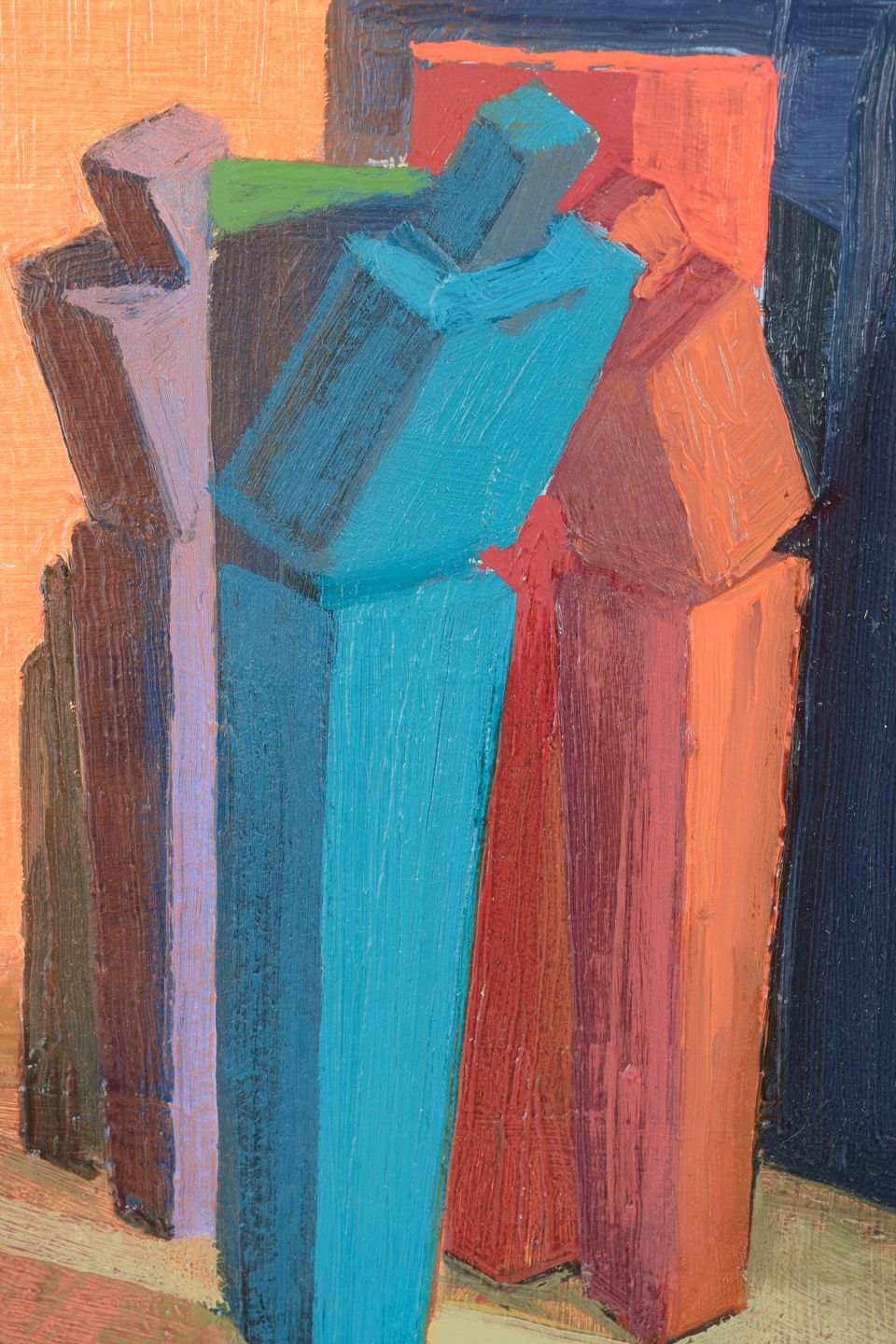 Early 21st-century Swedish painting often continues modernist traditions with clear references to Cubism and geometric abstraction. Compositions are constructed from simplified volumes and contrasting colour fields, emphasising the relationship between figure and space. Working on wooden board provides a solid support and enhances the structural, graphic character of the painted surface.