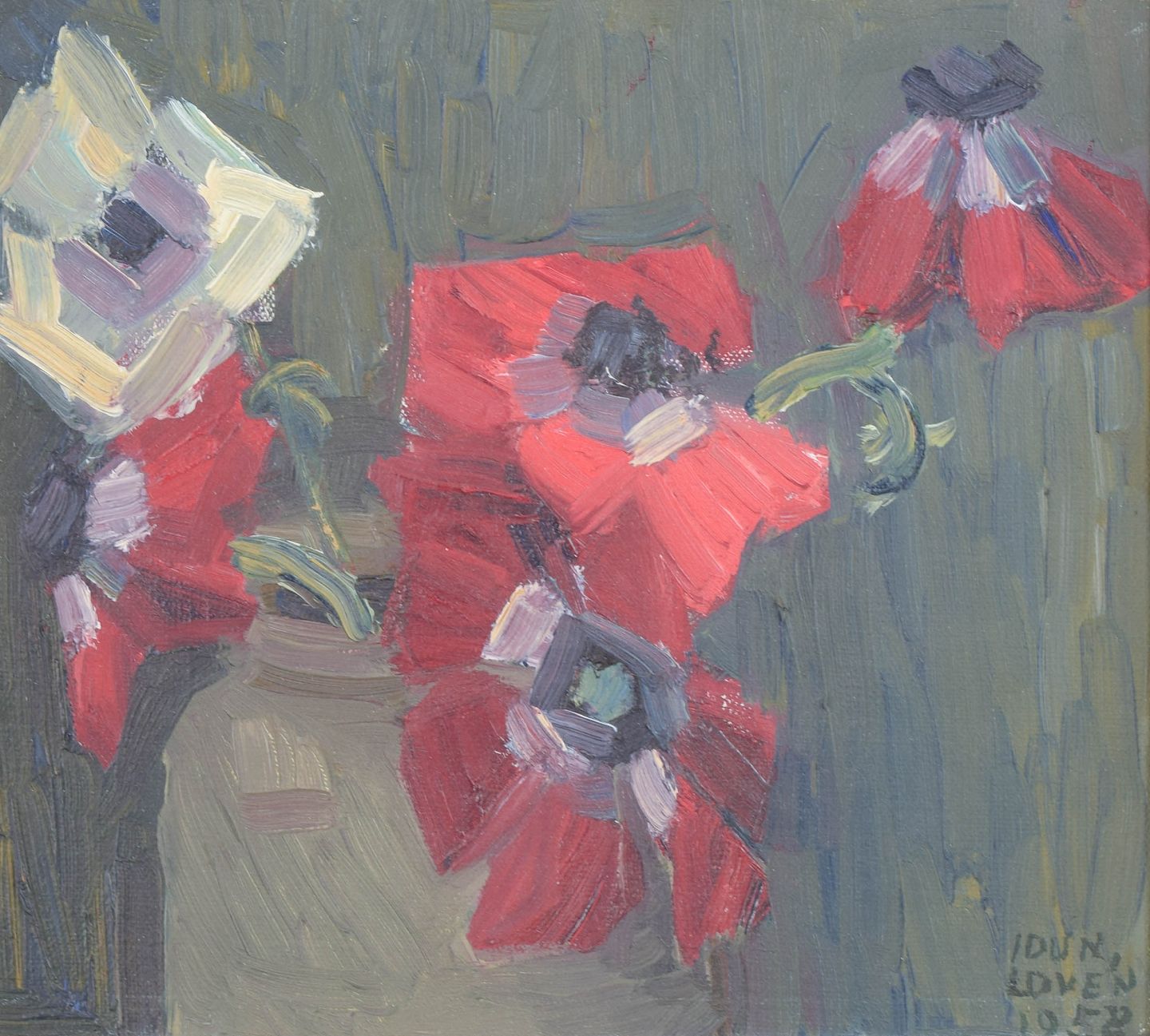Floral composition executed in a free and painterly style with visible brushwork and a muted background that accentuates the red and light-toned flower forms. Signed and dated 1958.