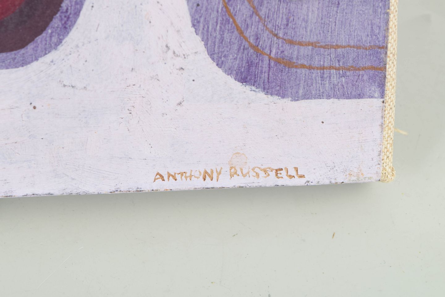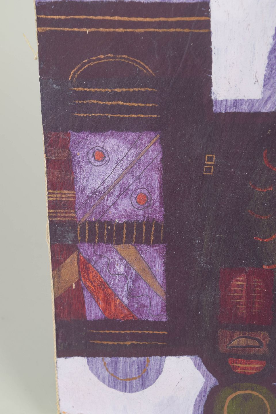 Abstract, painting-inspired composition with geometric and organic forms in muted purple, brown, and earthy tones, executed in mixed media and signed by the artist.