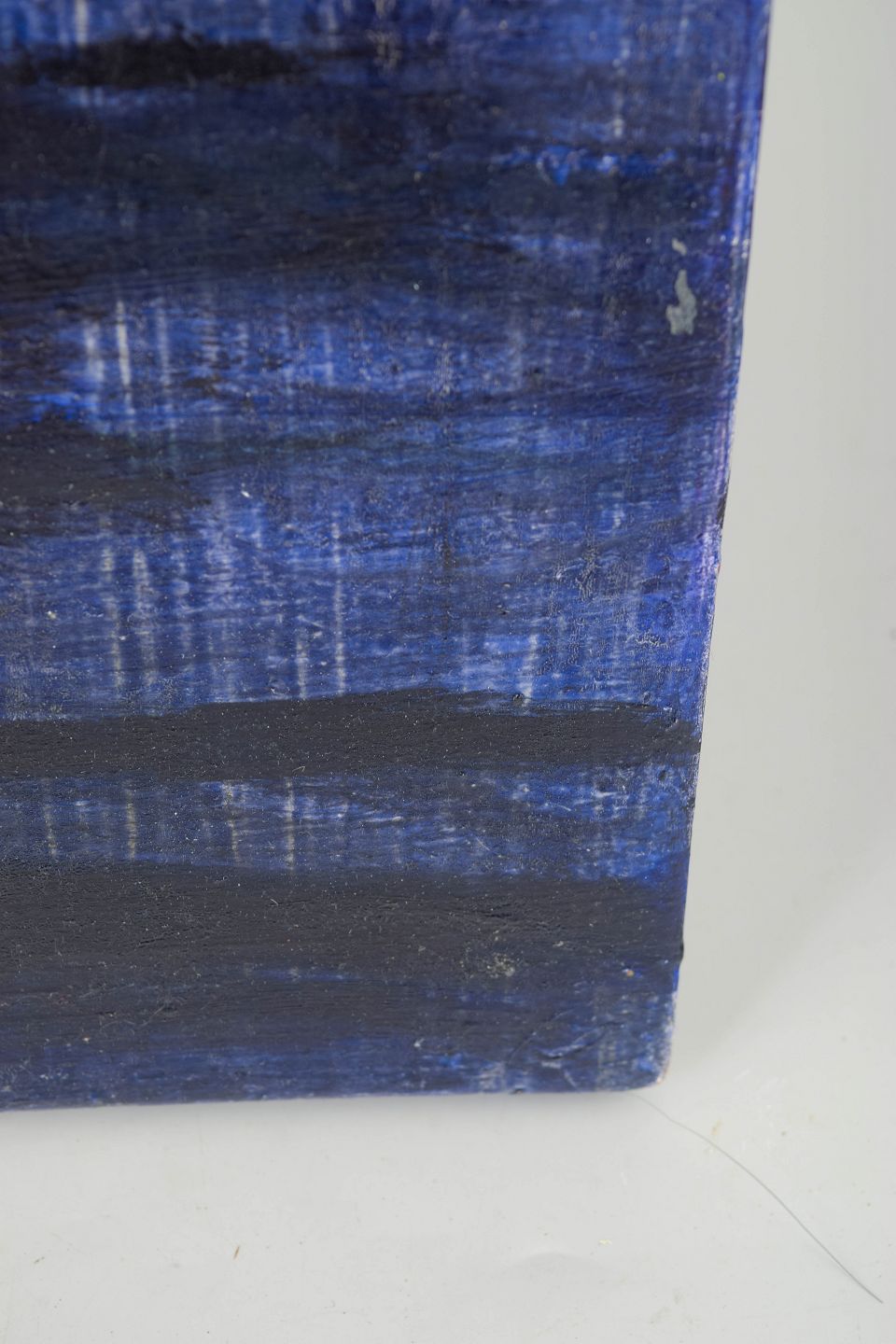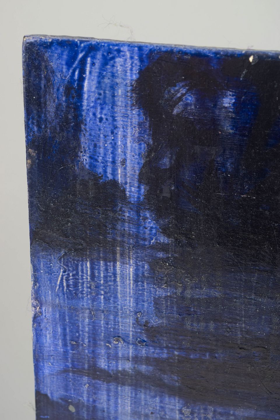 Abstract and atmospheric composition with horizontal, reflective colour fields in blue and dark tones, executed in oil on board.