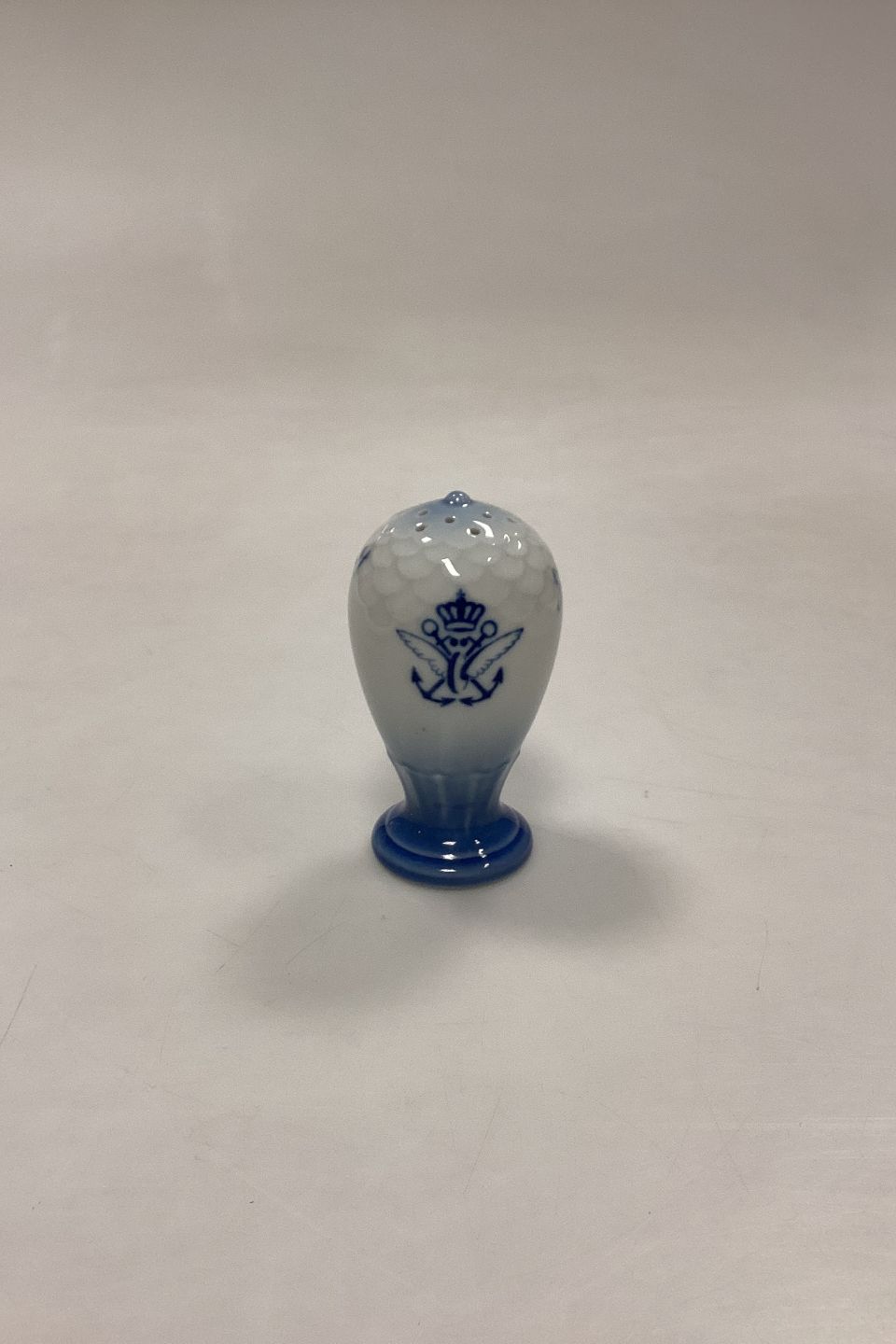 Bing and Grondahl Blue Tone Salt Shaker No. 52 A with Logo. Logo with crown, wheel with wings and anchors is most likely from a shipping company. Measures 7.5 cm / 2.95 in.