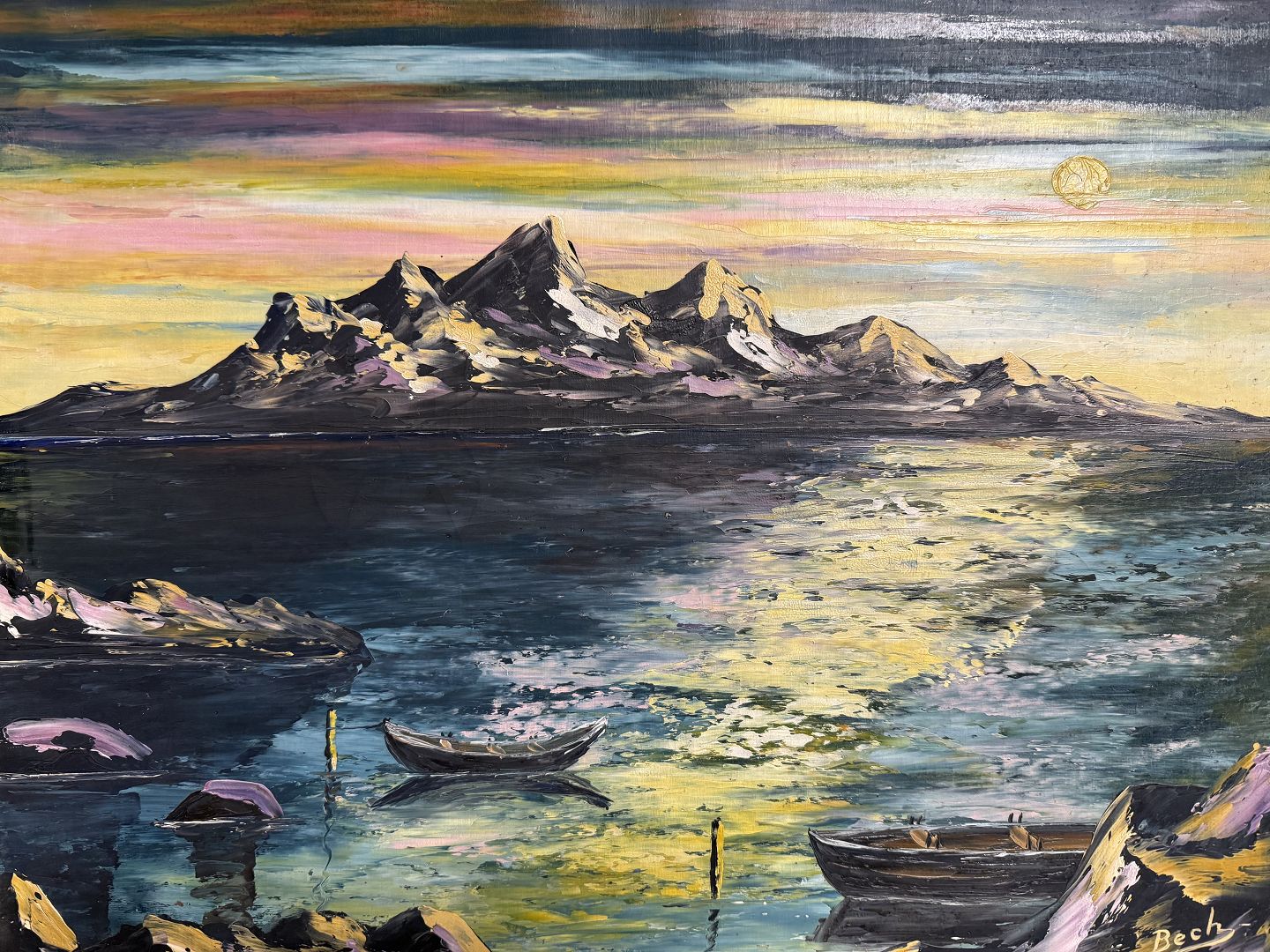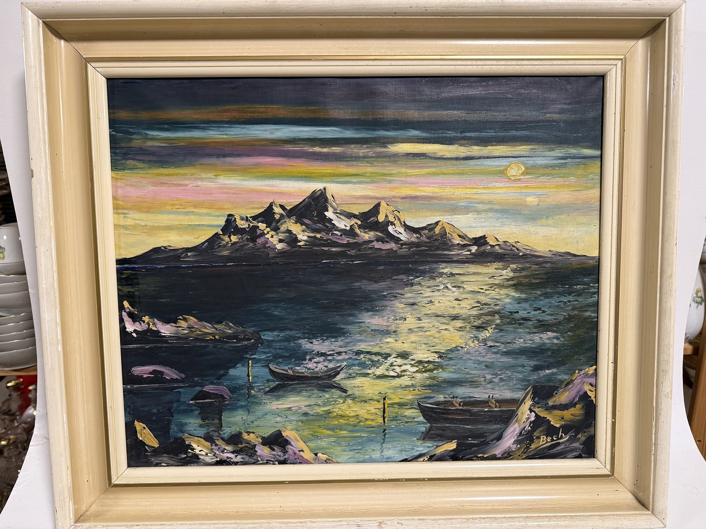 Bech Vogt-Sørensen (1919-?), Oil painting on canvas of sea and island in moonlight, signed Bech, Dimensions with frame: 56.5x47.5cm