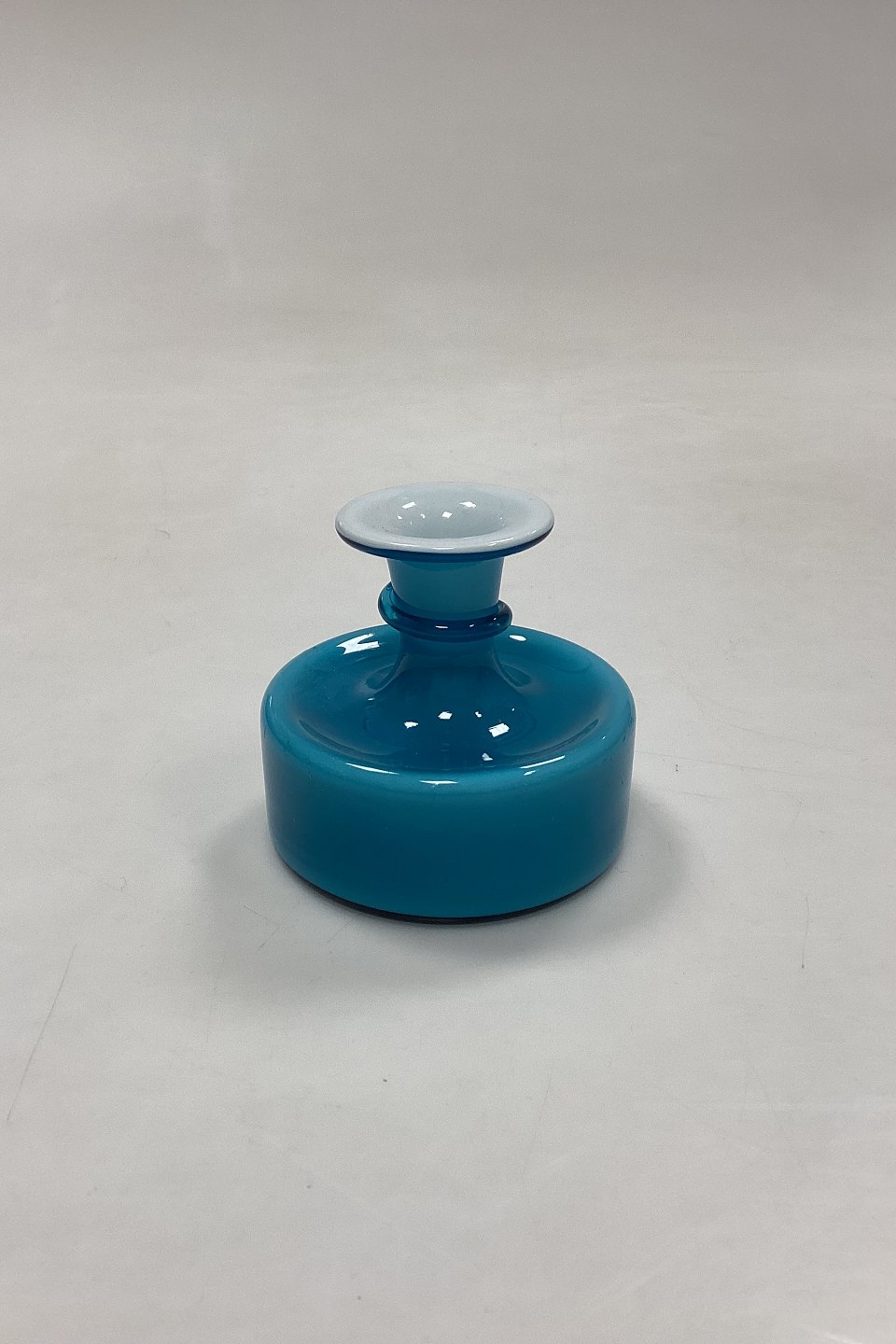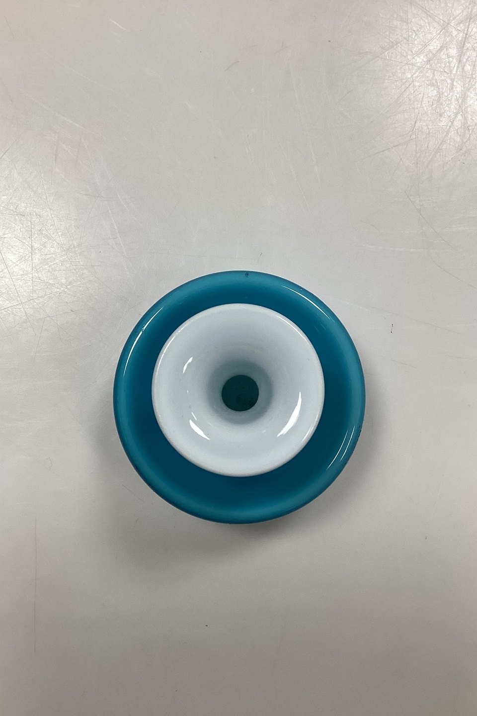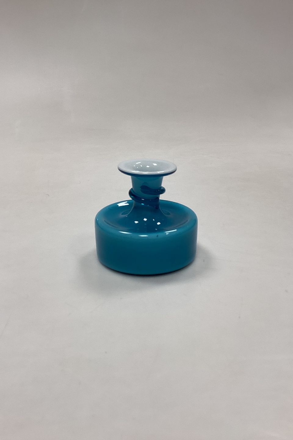 Holmegaard Palette Glass Candle Holder. Designed by Michael Bang. Colour: Turquoise blue and white inside. Traces of use on the bottom and small bubble on the edge, see photo.