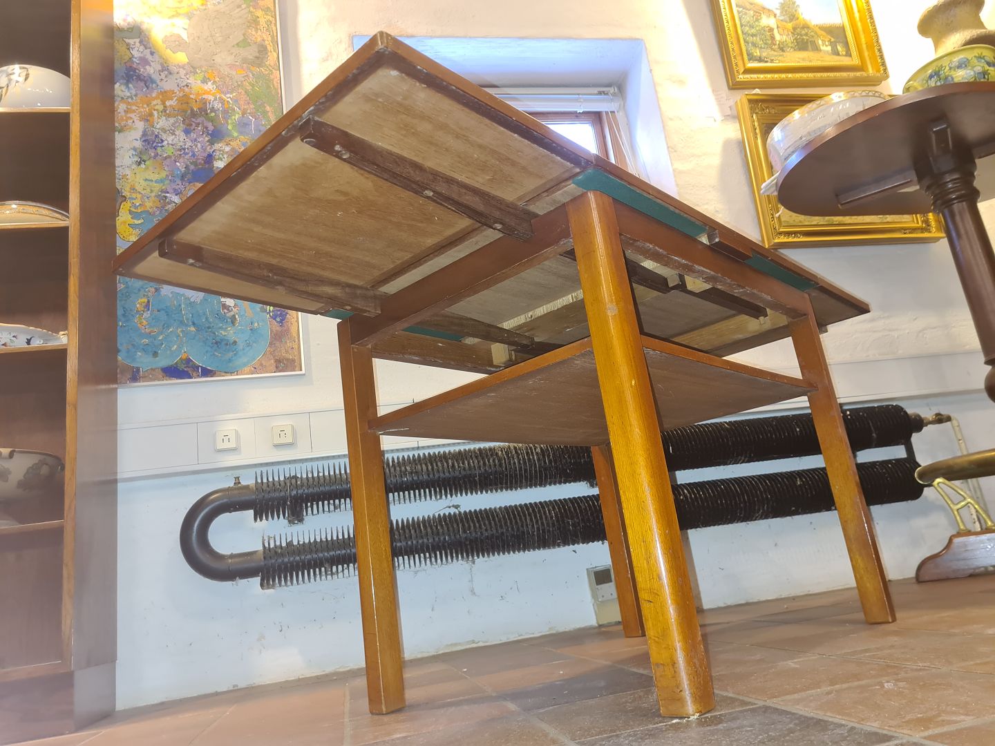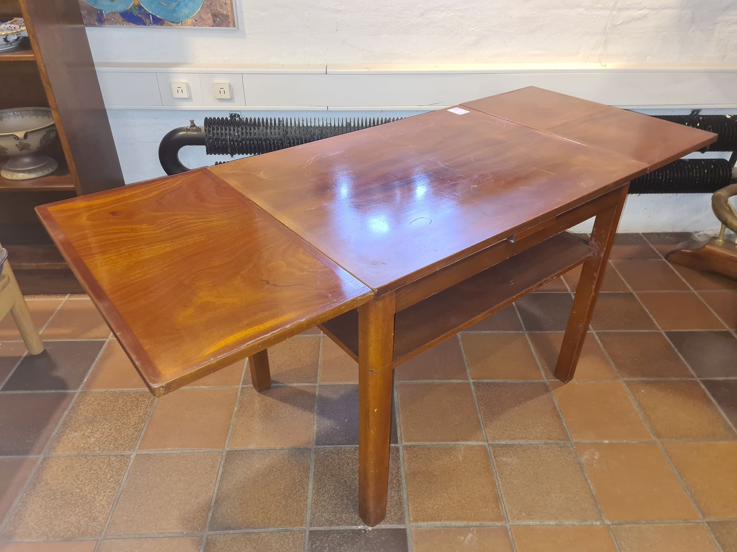 Text available in Danish: Dansk møbelsnedker sofabord m. hollandsk udtræk. Udført m. plader i fineret mahogni.