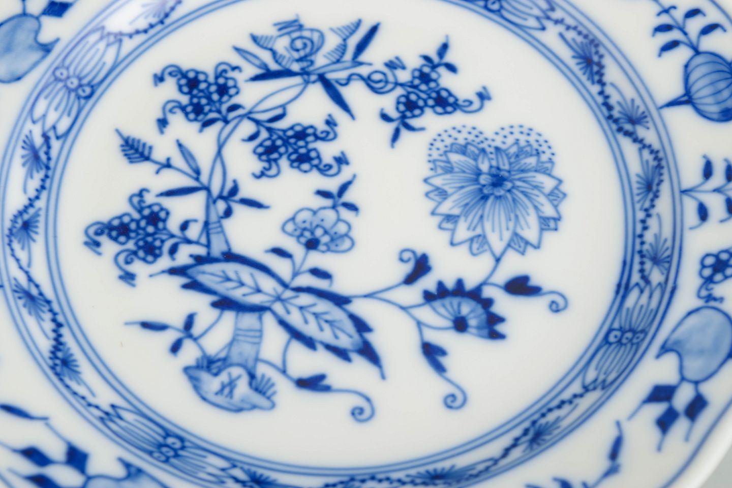 The Blue Onion pattern was introduced by Meissen in 1739 and was inspired by East Asian porcelain, featuring stylised fruit and floral elements rendered in underglaze blue. The design became one of the manufactory’s most enduring tableware patterns. Around 1900, Meissen continued producing Blue Onion services of consistently high quality, characterised by crisp decoration, durable glazing, and adherence to traditional forms rooted in centuries of porcelain craftsmanship.