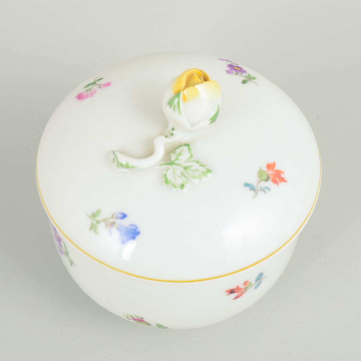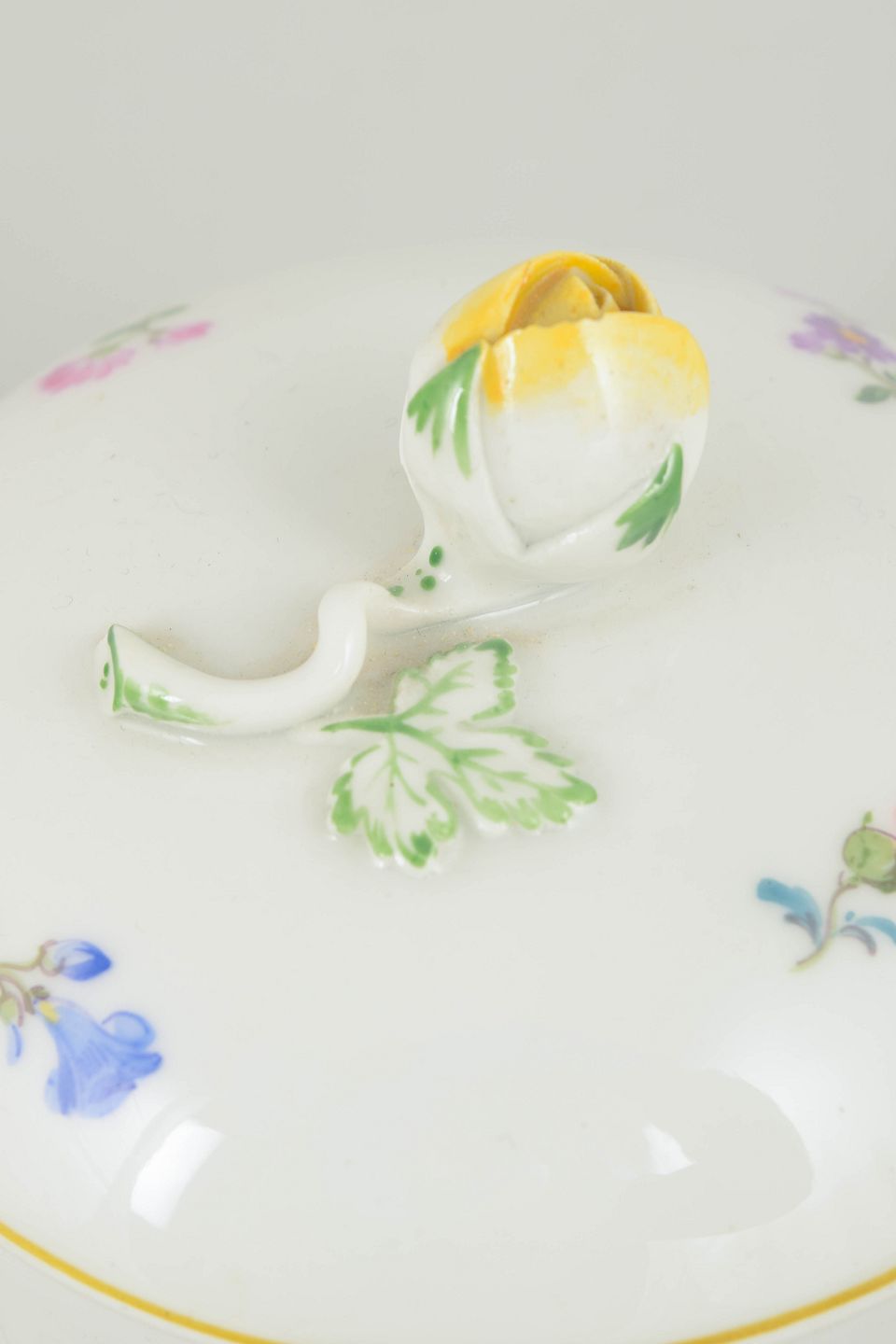 Round lidded bowl in white porcelain decorated with scattered hand-painted polychrome flowers and subtle gilt detailing to the rim and foot. The finial is formed as a rosebud. Marked to the base with the Meissen crossed swords.