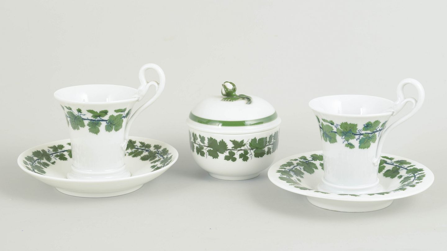 A pair of porcelain coffee cups with swan handles and matching saucers, accompanied by a sugar bowl, decorated with a green vine leaf border. Some pieces are first quality, others cancelled with two incised lines. Marked with the Meissen crossed swords.