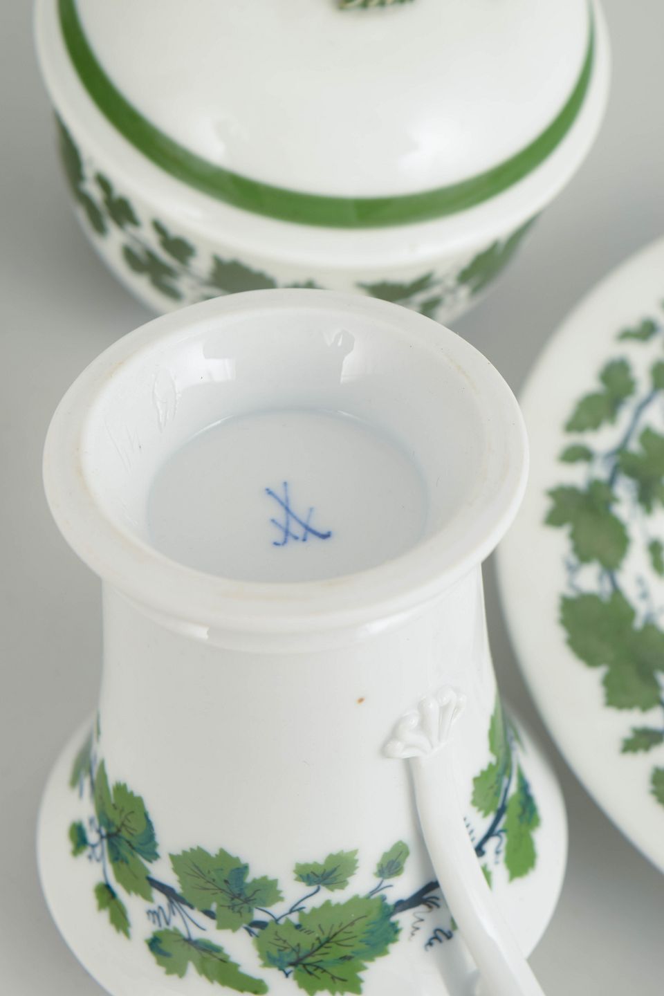 Founded in 1710, Meissen is regarded as the oldest porcelain manufactory in Europe. Renowned for its hard-paste porcelain, hand-painted decoration and the iconic crossed swords mark, Meissen has long produced refined tableware. Botanical motifs such as vine leaves form part of the manufactory’s classic decorative tradition, reflecting both technical mastery and continuity of design.