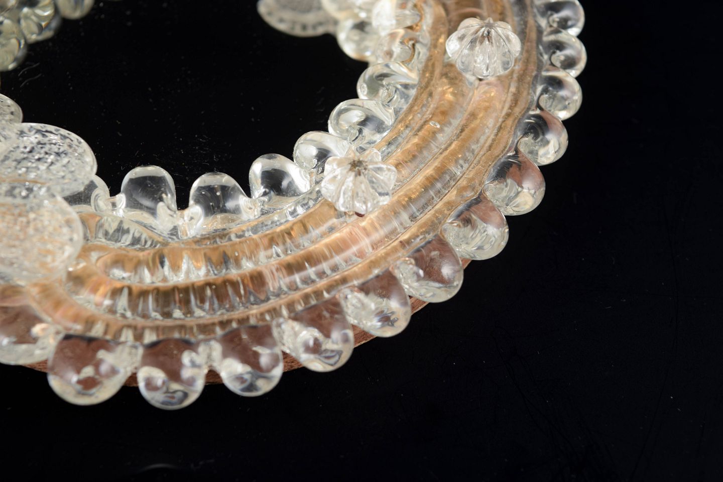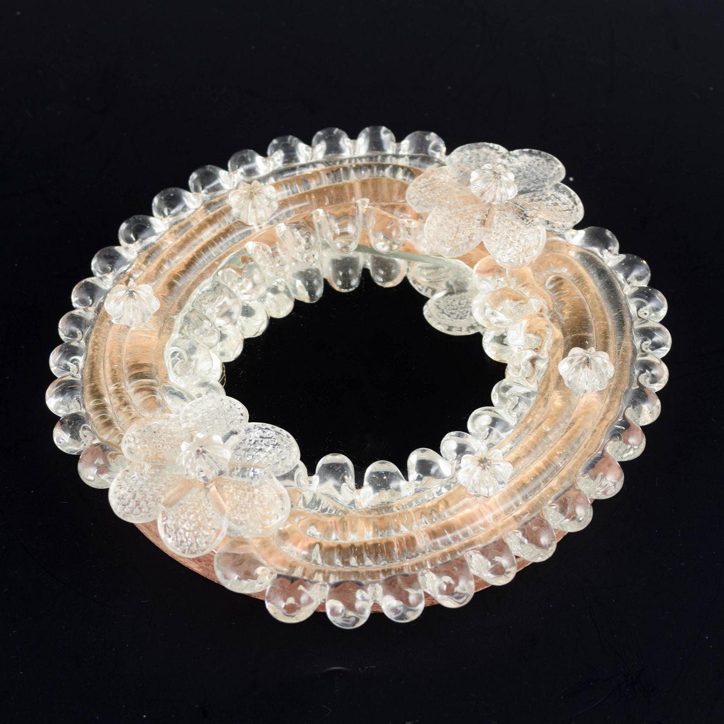 Small decorative wall mirror with a frame of hand-shaped Murano glass in warm rose tones and clear glass. The frame is composed of applied floral and bud-like elements with ribbed and bubbled textures, characteristic of Venetian glass design from the mid-20th century. The mirror plate is centrally set within the sculptural glass frame.