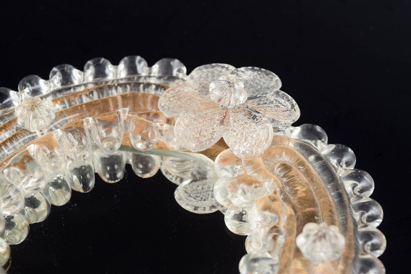 Murano has been a centre of Venetian glassmaking since the Renaissance, renowned for its technical mastery and decorative innovation. During the 1950s and 60s, mirrors with artistic glass frames became popular, often adorned with flowers, beads, and organic elements in clear and coloured glass. These mirrors were produced in small workshops and combine traditional craftsmanship with the decorative aesthetics of the period, making them highly collectible today.
