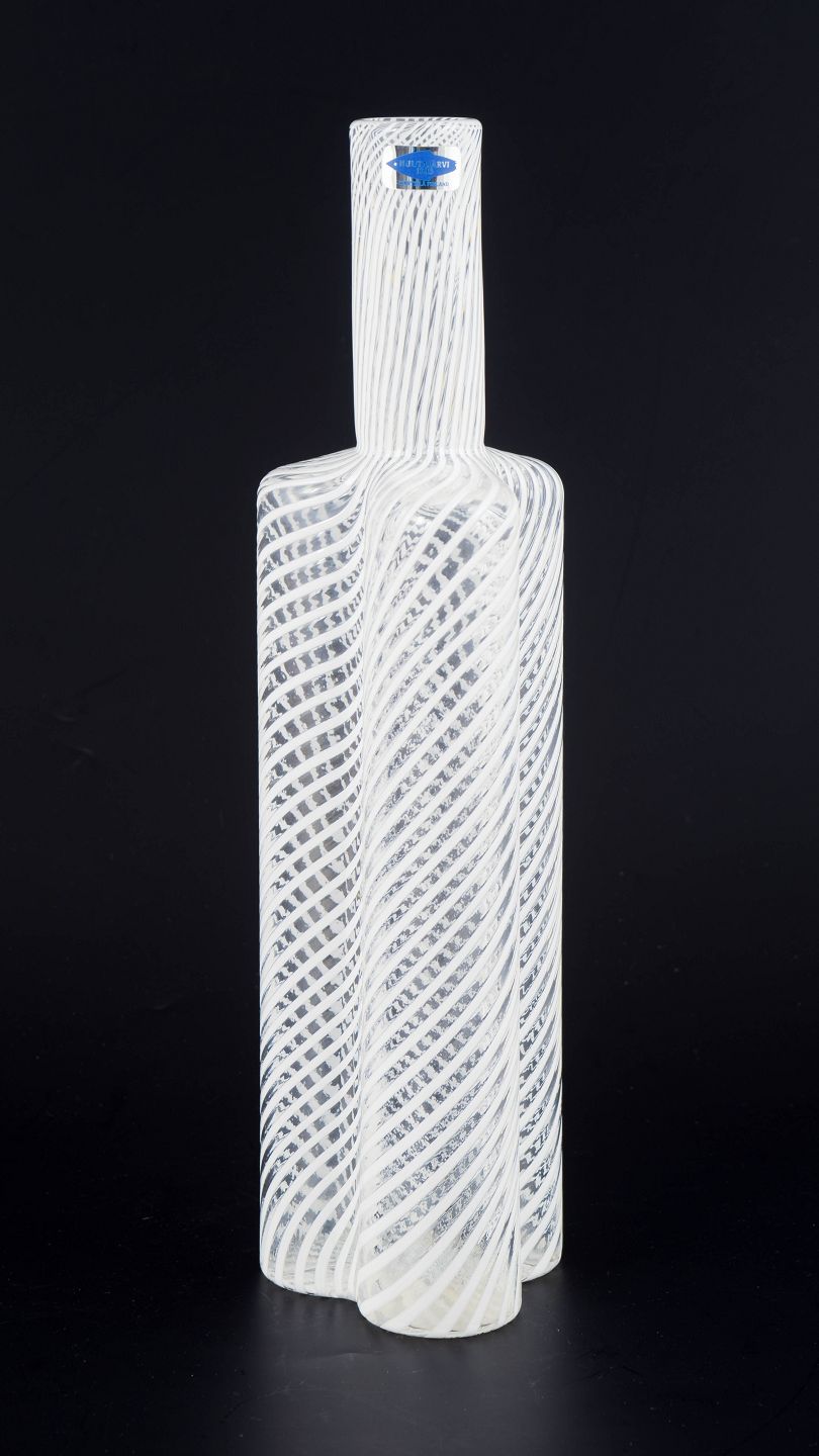 Slender bottle-shaped vase in clear art glass with integrated white spiral and thread pattern executed in layered technique. The piece is mouth-blown and retains its original Nuutajärvi 1793 Wärtsilä Finland sticker, as well as a signature. The form and optical decoration are characteristic of Finnish art glass from the 1970s.