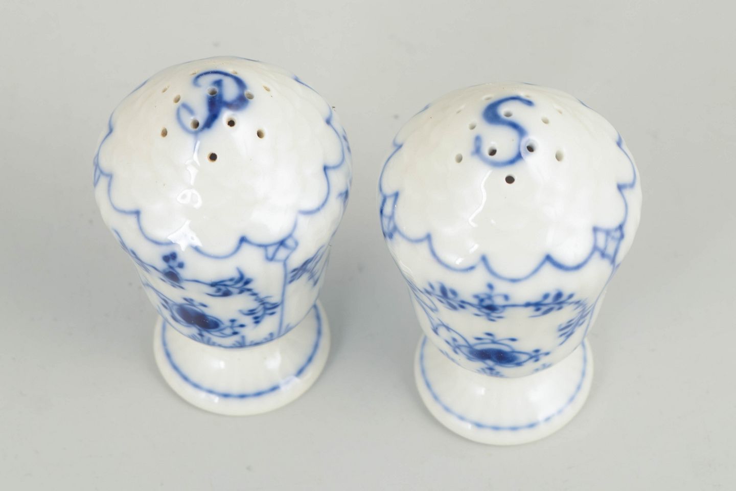 Salt and pepper shakers in hand-painted underglaze cobalt blue decoration in the classic Blue Fluted Plain pattern. Models 1/467 and 1/480. First quality.