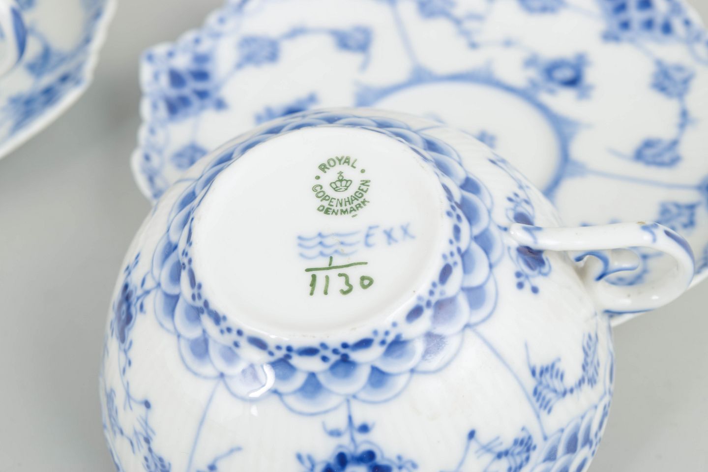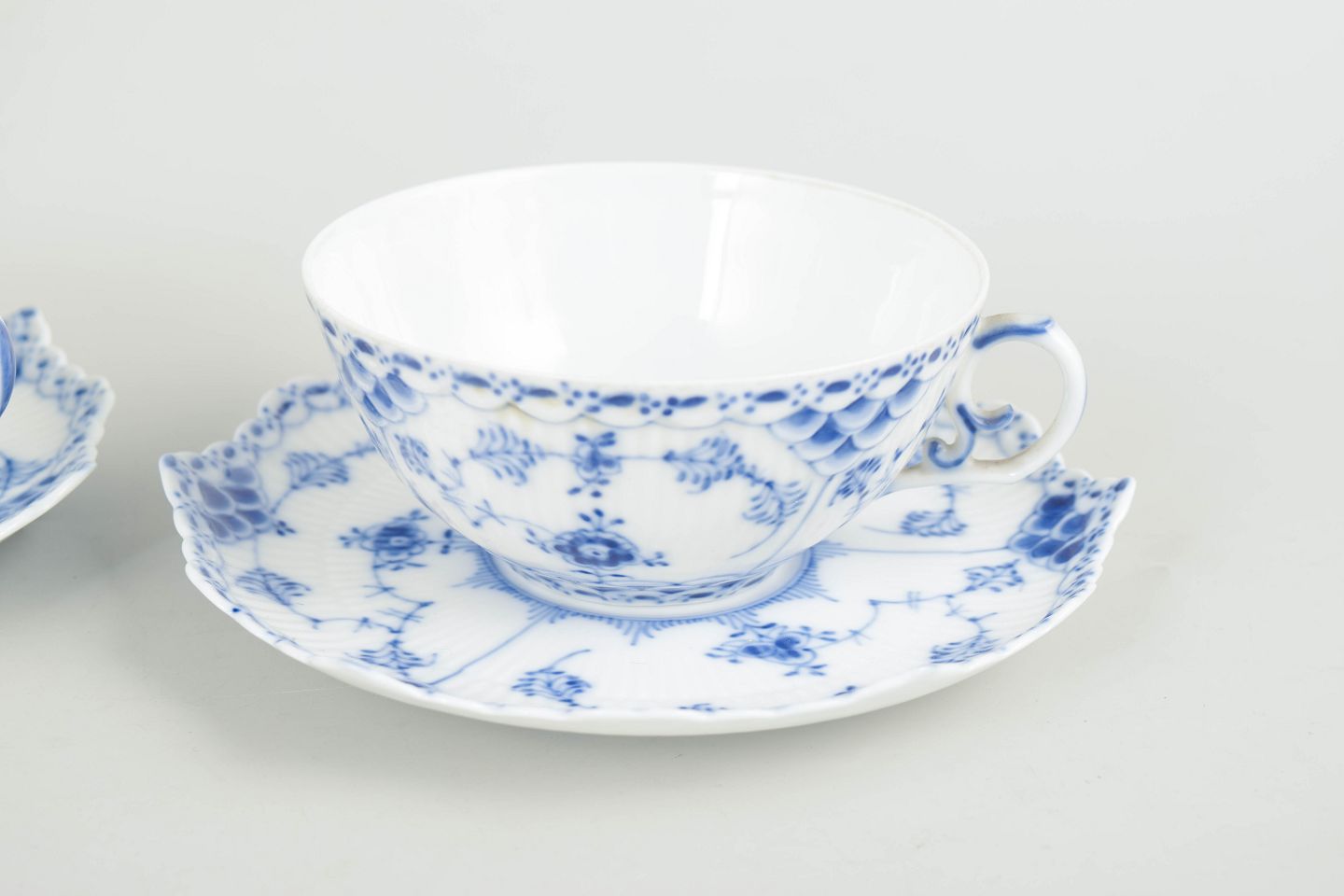 Royal Copenhagen, Blue Fluted Full Lace tea cups with saucers, set of 2.