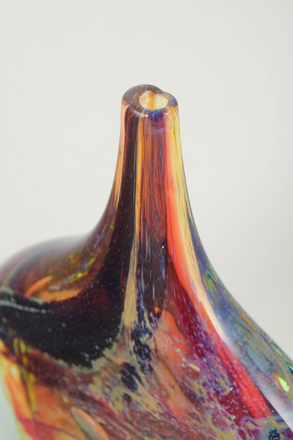 Organically shaped art glass vase in heavy, hand-blown glass with encapsulated swirling colours in amber, orange, and dark contrasting tones, finished with a clear outer layer. Freely formed asymmetric profile with pronounced weight in the base. Signed to the underside “Mdina glass, Malta”.
