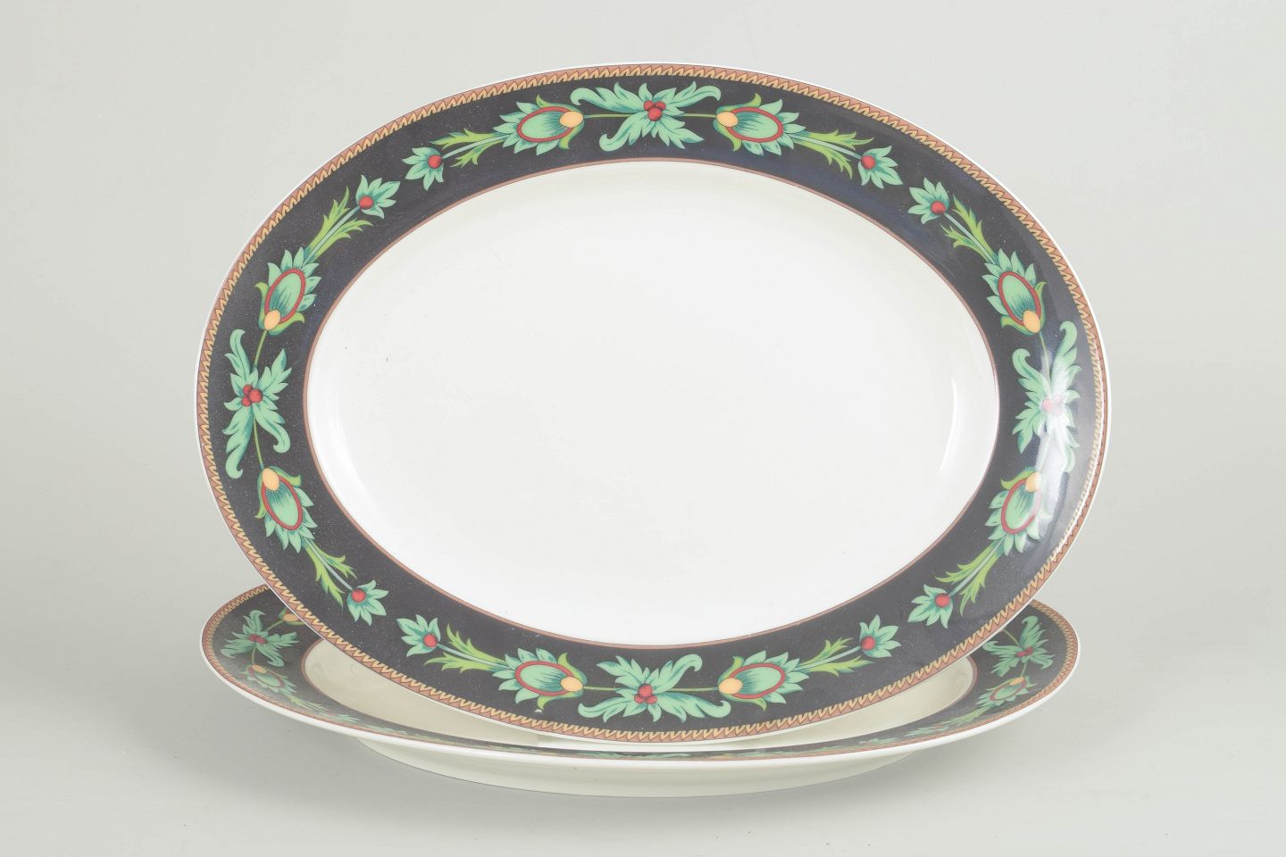 Set of two oval porcelain dishes by Rosenthal Classic from the Mayfair series, decorated with a dark border, stylised green foliate motifs and gilt detailing, produced in the 1980s.