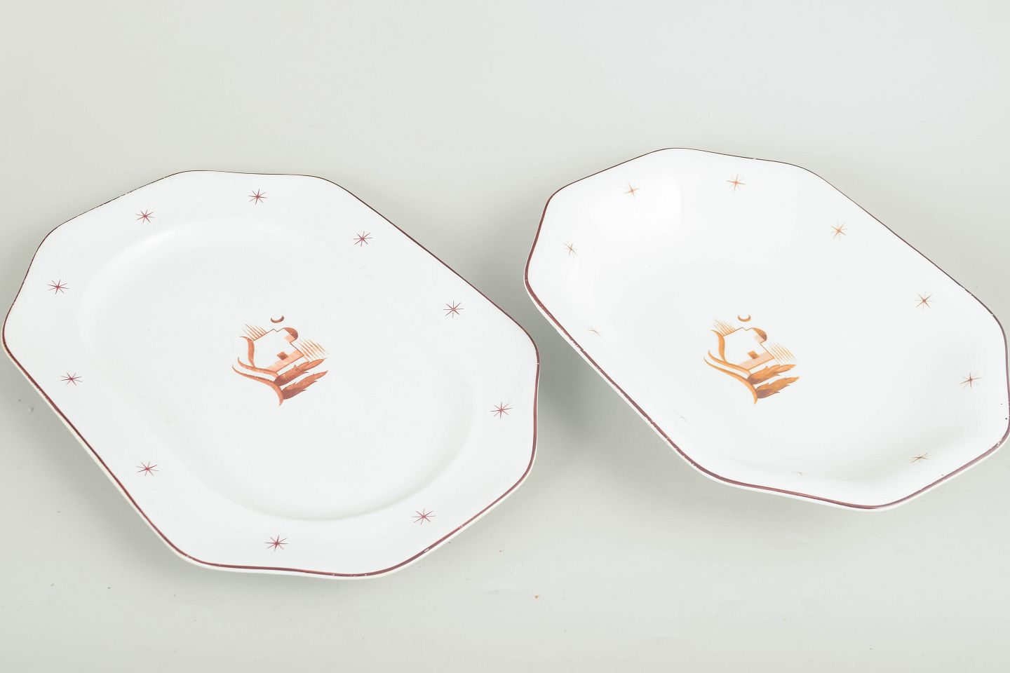 Dishes in glazed earthenware with a faceted form, brown border line and star motifs, featuring a central oriental landscape motif. Orient model. Two closely related sizes.
