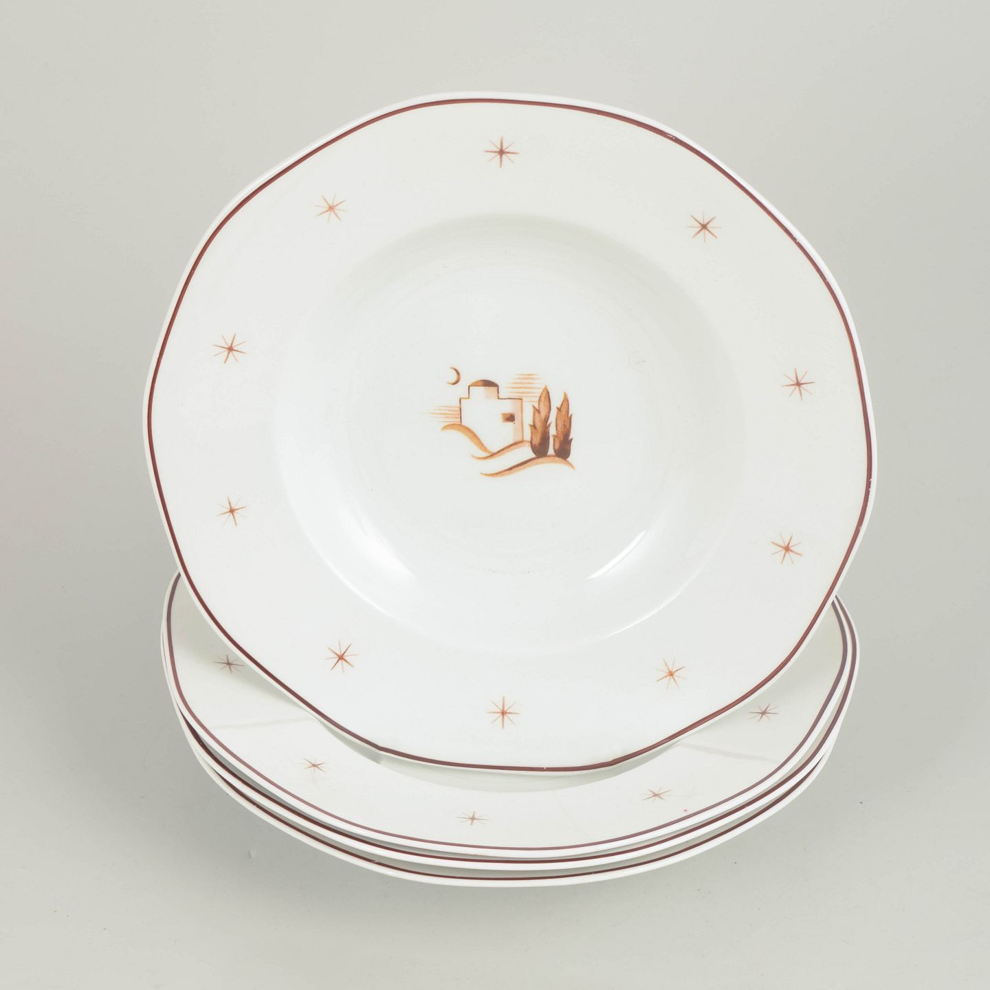 Deep plates in glazed earthenware with a scalloped rim, brown border line and star motifs, featuring a central oriental landscape motif. Orient model.