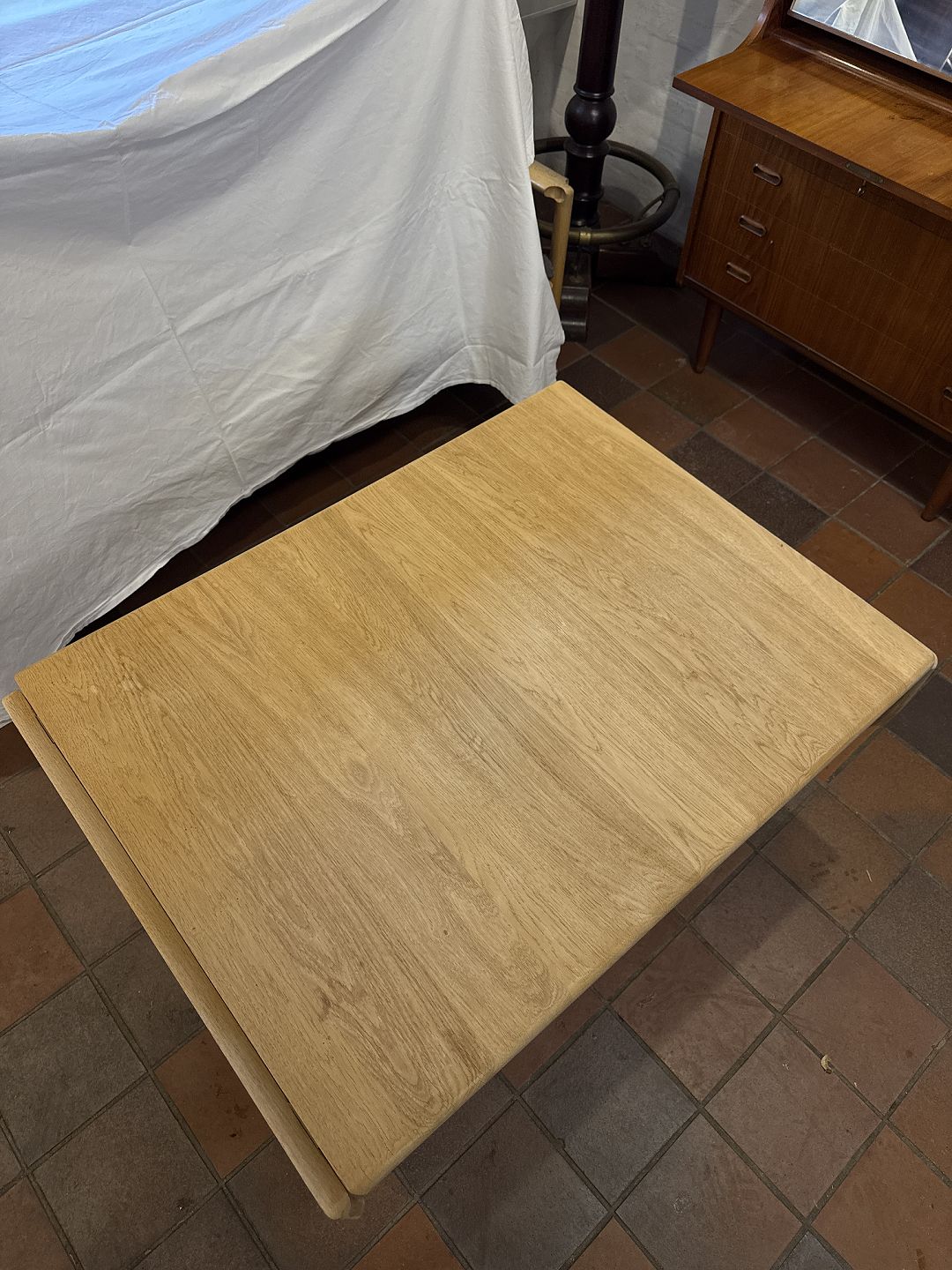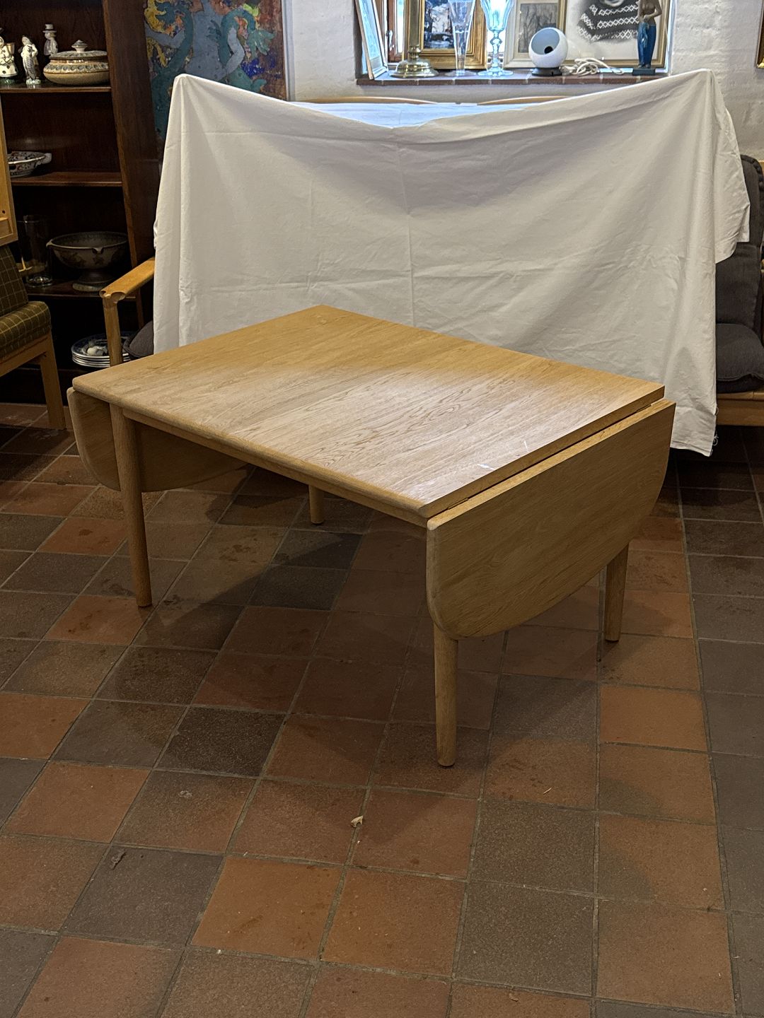 Text available in Danish: Hans J. Wegner sofabord m. Klapper model GE85 udført i massiv sæbehandlet egetræ. Fremstillet hos Getama i 1990’erne.