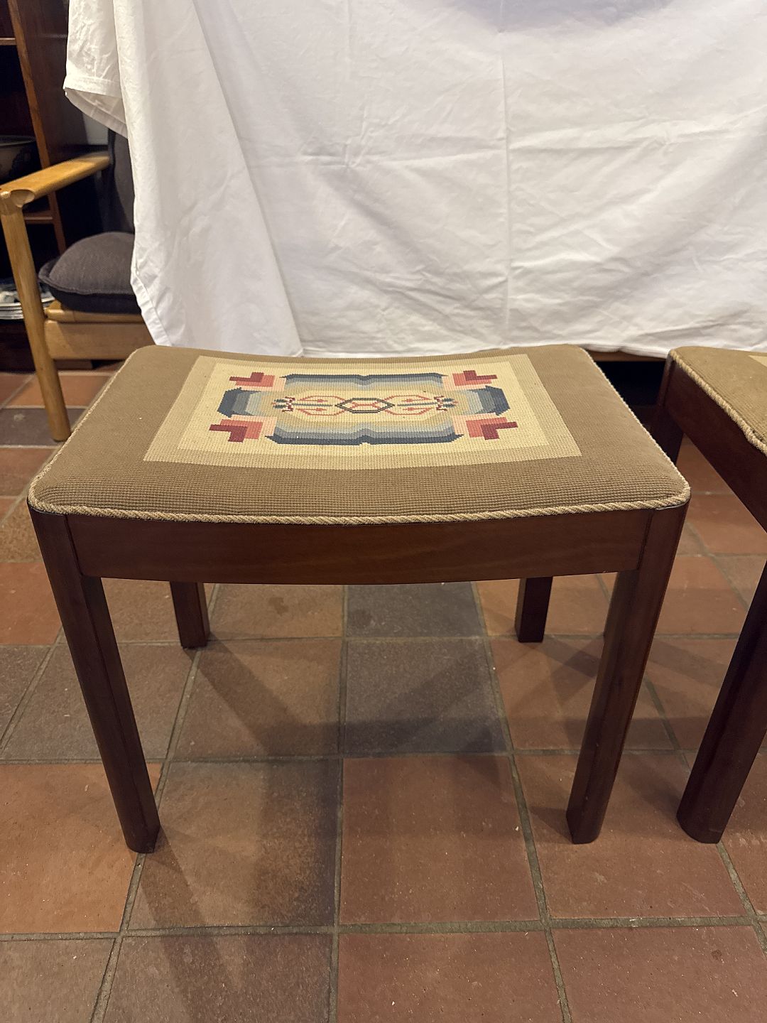 Text available in Danish: Par taburetter i mahogni.