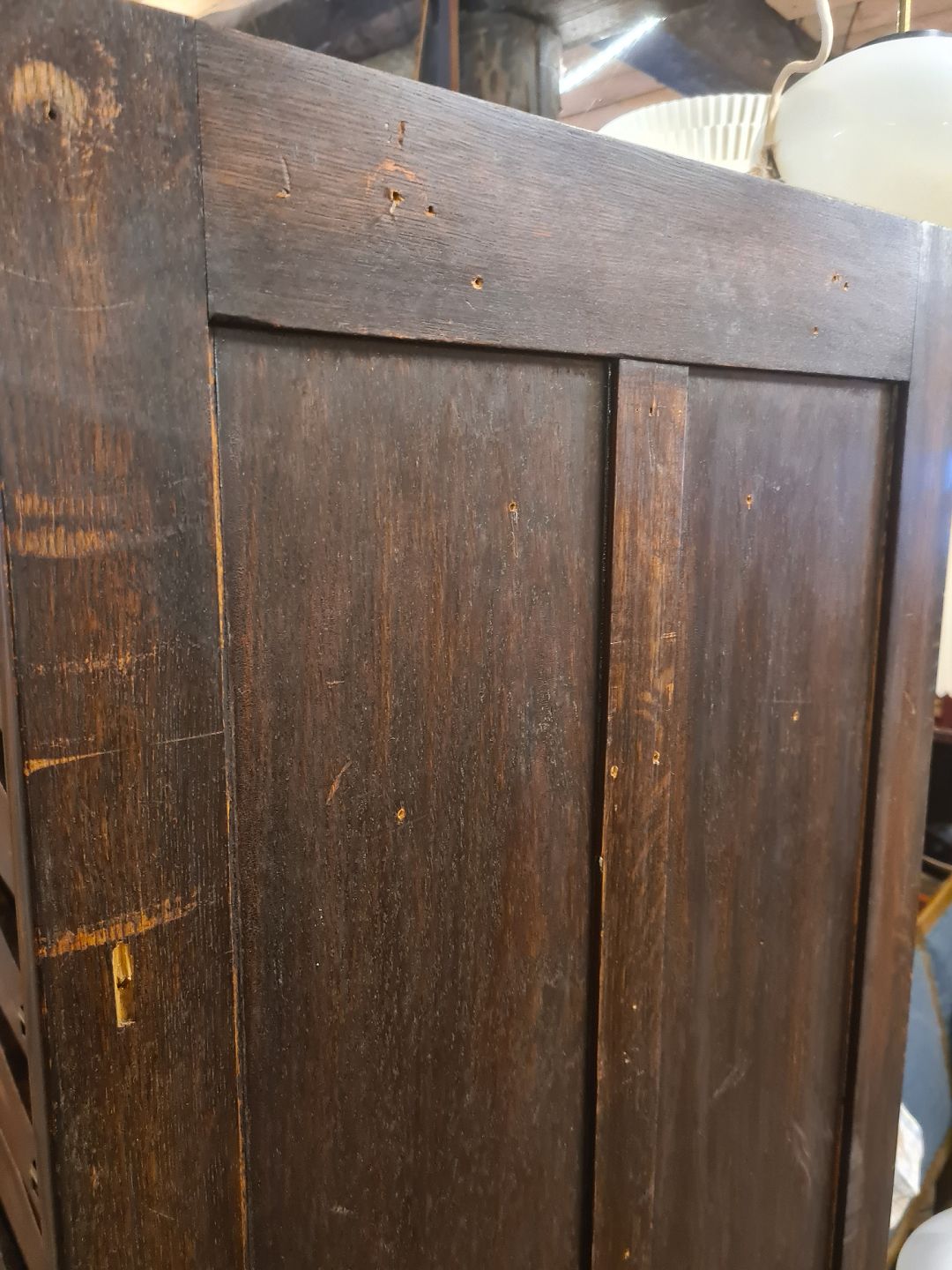 Text available in Danish: Ældre arkivskab m. jalousilåge, udført i mørk bejdset egetræ.