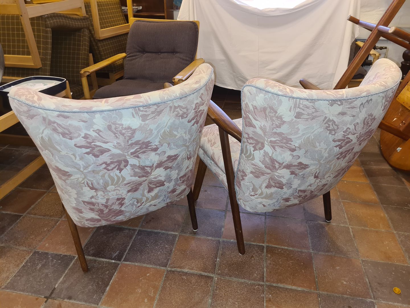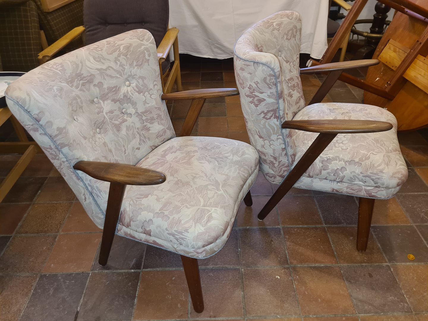 Text available in Danish: Erhardsen & Andersen par lænestole med stel i teak, betrukket med møbelstof.