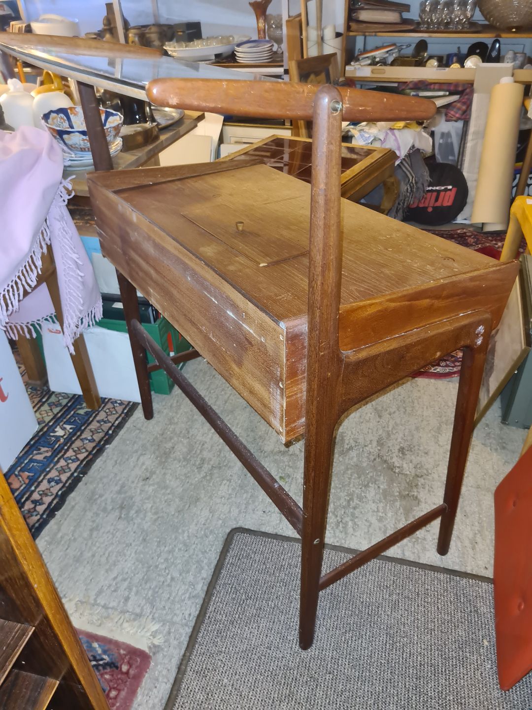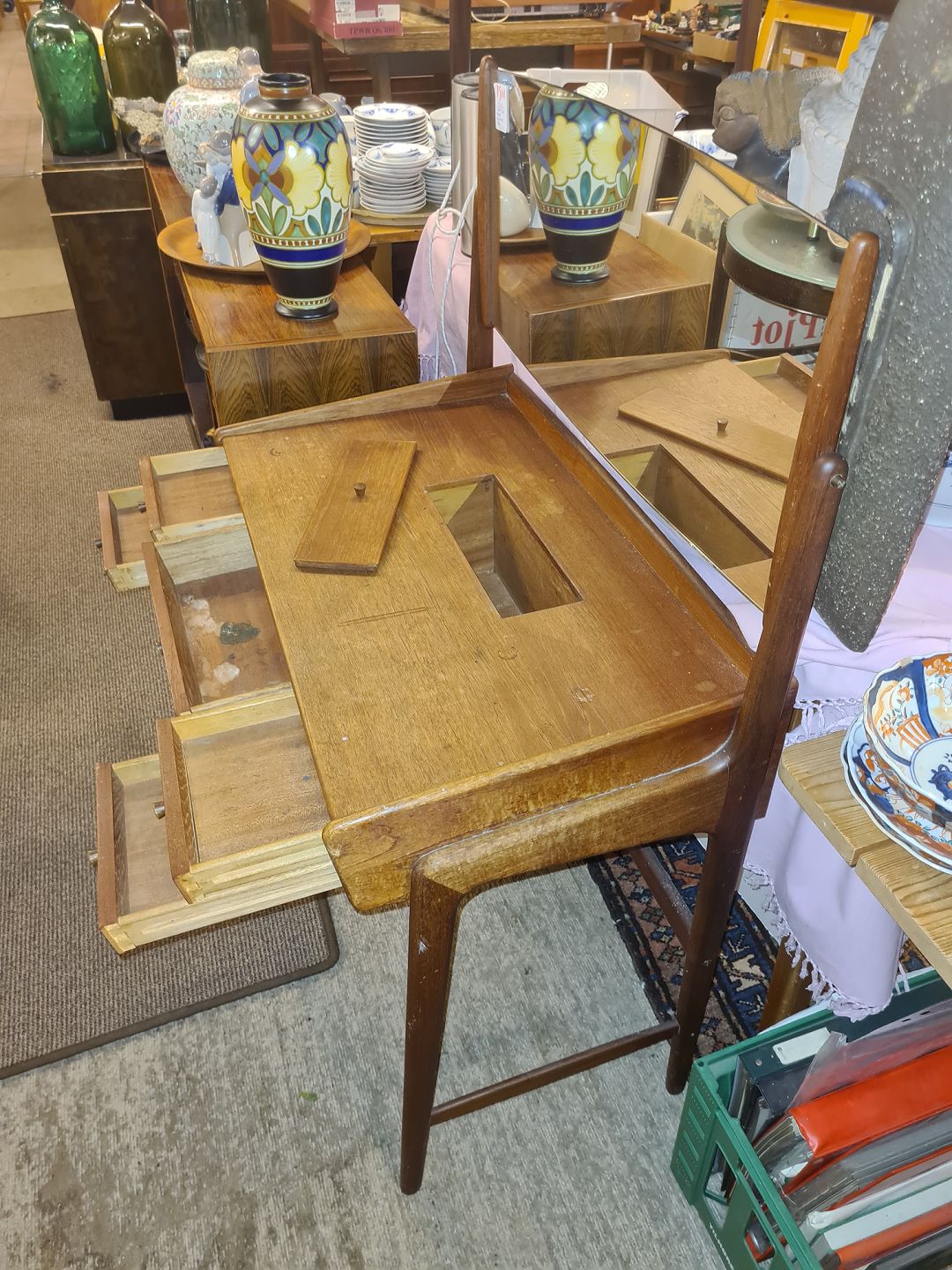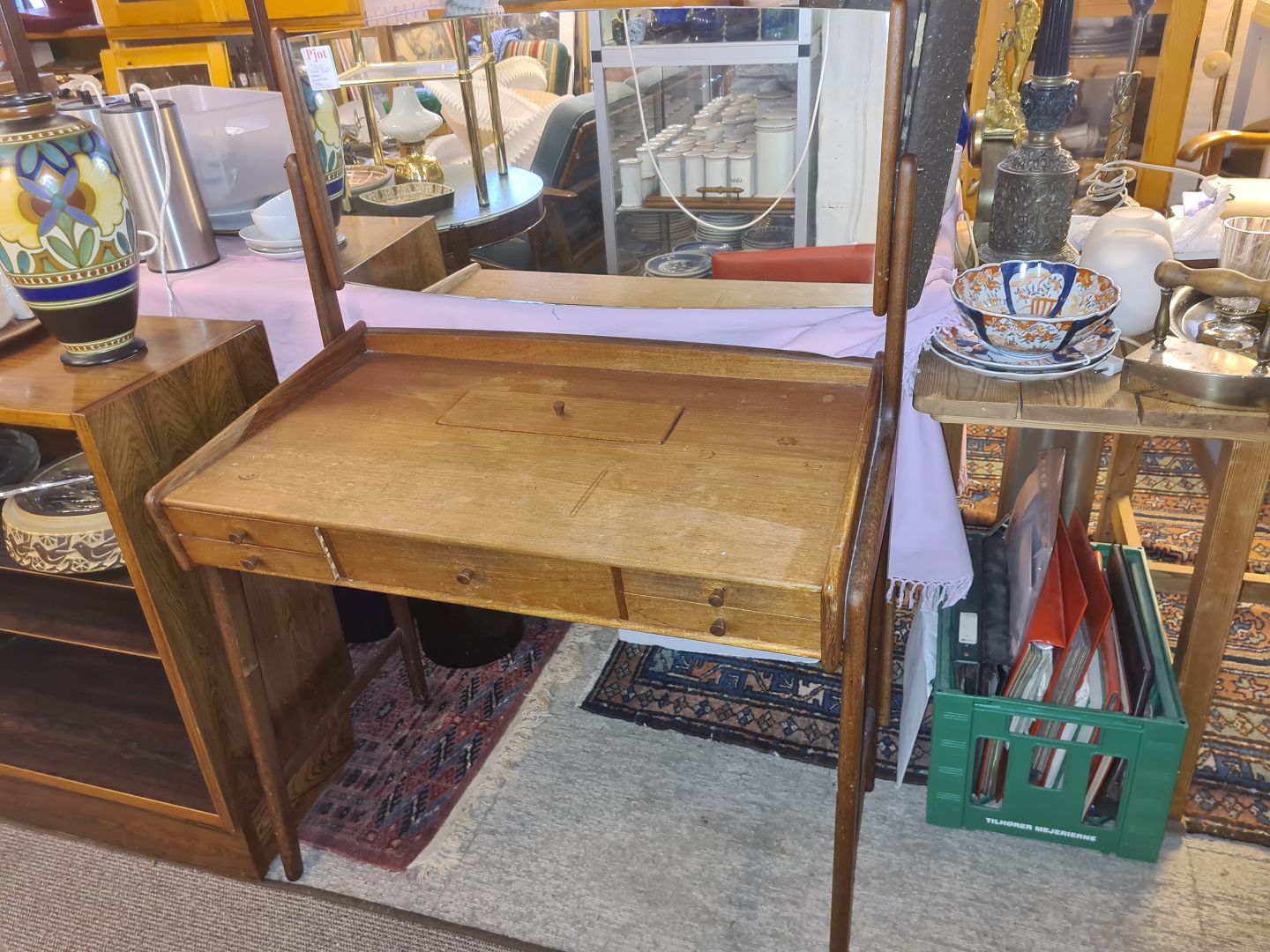 Text available in Danish: Svend Aage Madsen sminkebord i teak m. spejl med vippe funktion.