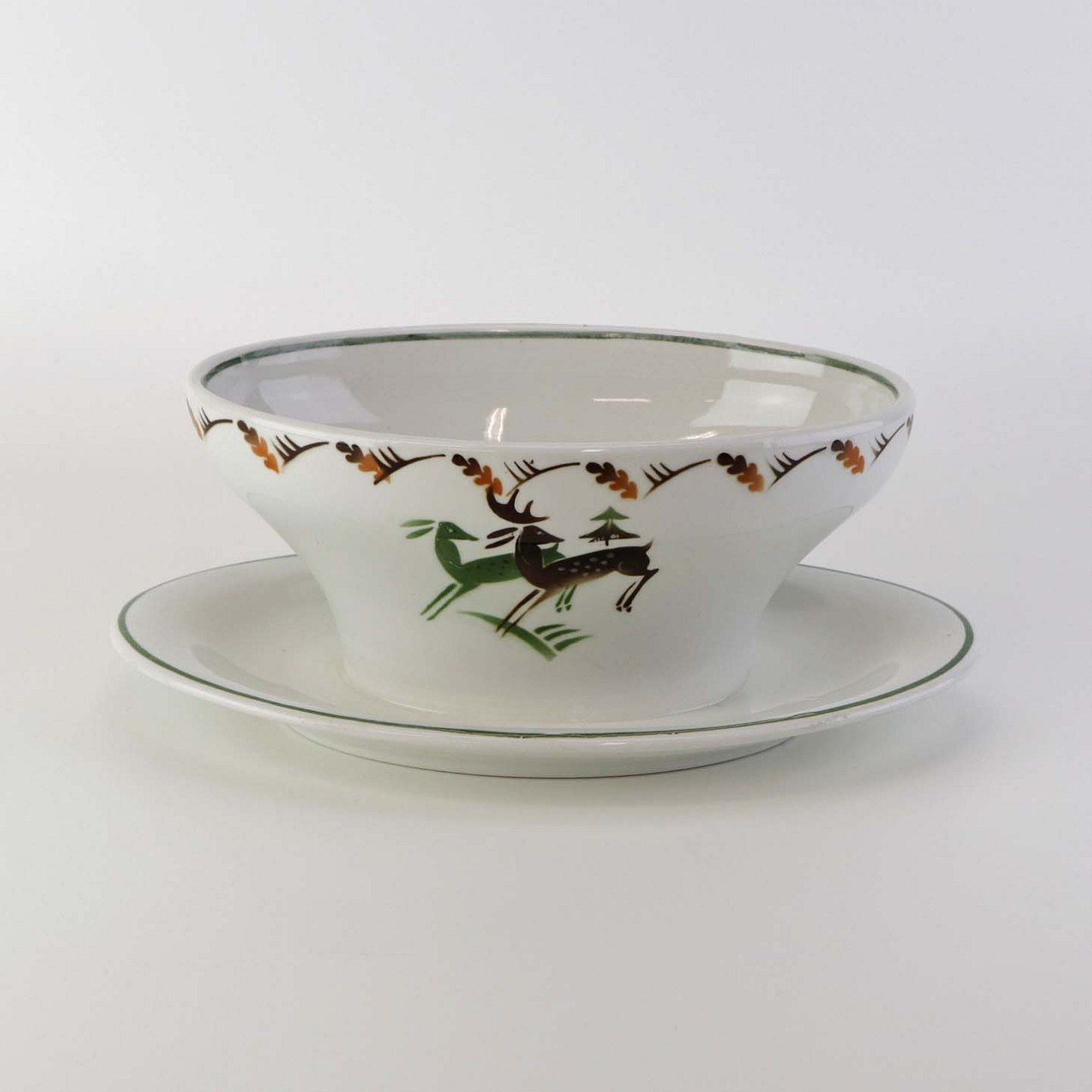 Fajancestel i stelform C med dekoration af grøn og brun hjort på lys baggrund med kantbort af blade i brune nuancer.