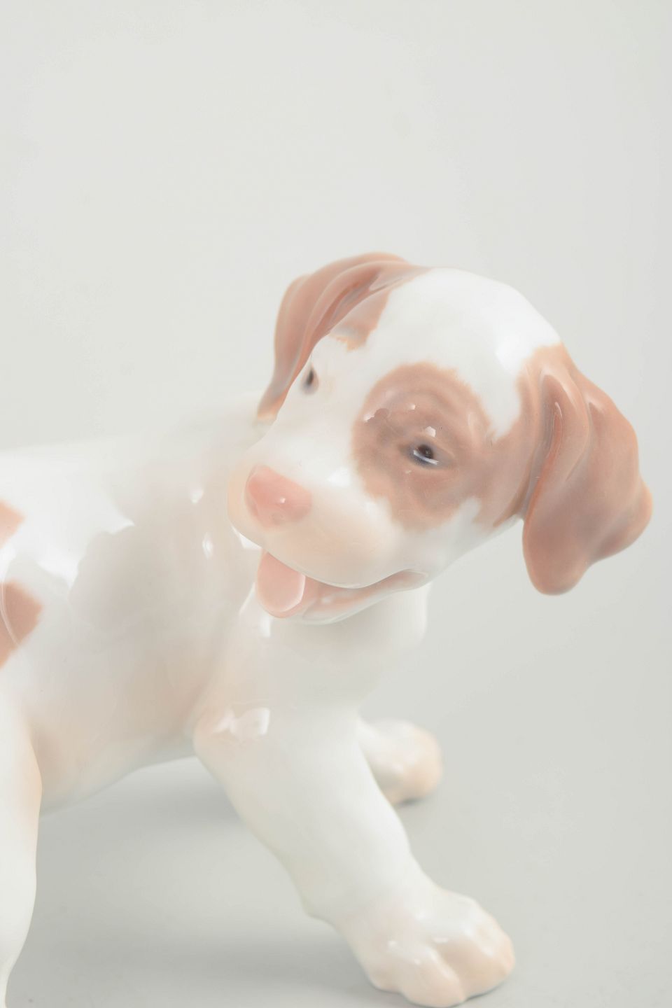 Naturalistically modelled porcelain figurine depicting a standing puppy with soft forms and hand-painted decoration in light brown and cream tones. Model 2026.