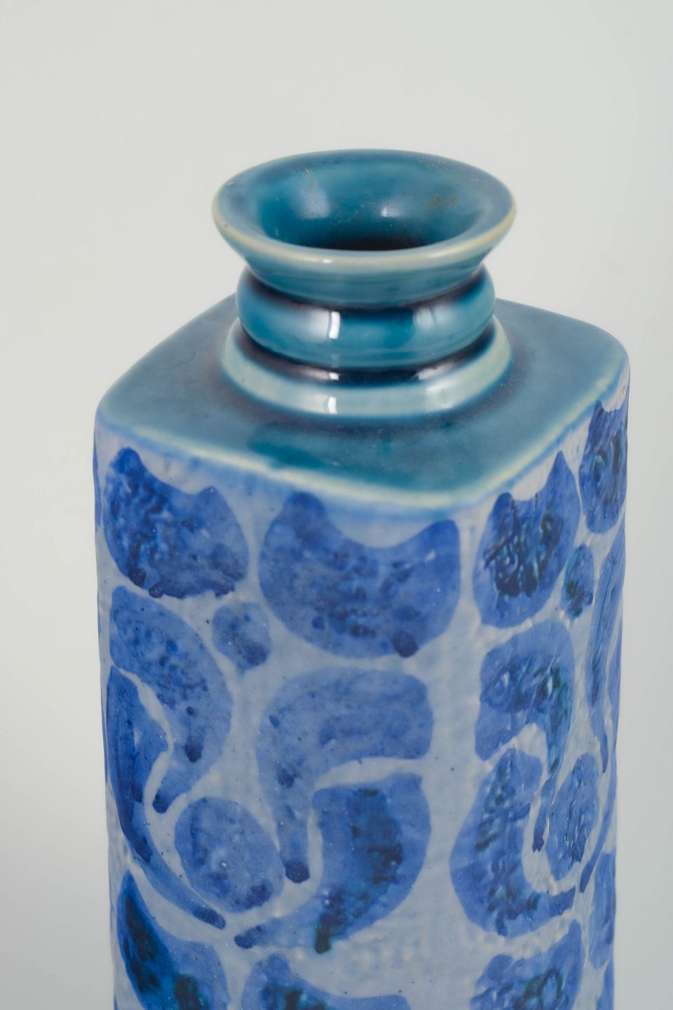 Cylindrical stoneware vase with a light grey ground glaze and hand-decorated blue pattern in organic, repeating forms. Short neck with a subtly profiled rim. Stamped to the base with UE Sweden, Upsala Verkstad and model number 7052 G.