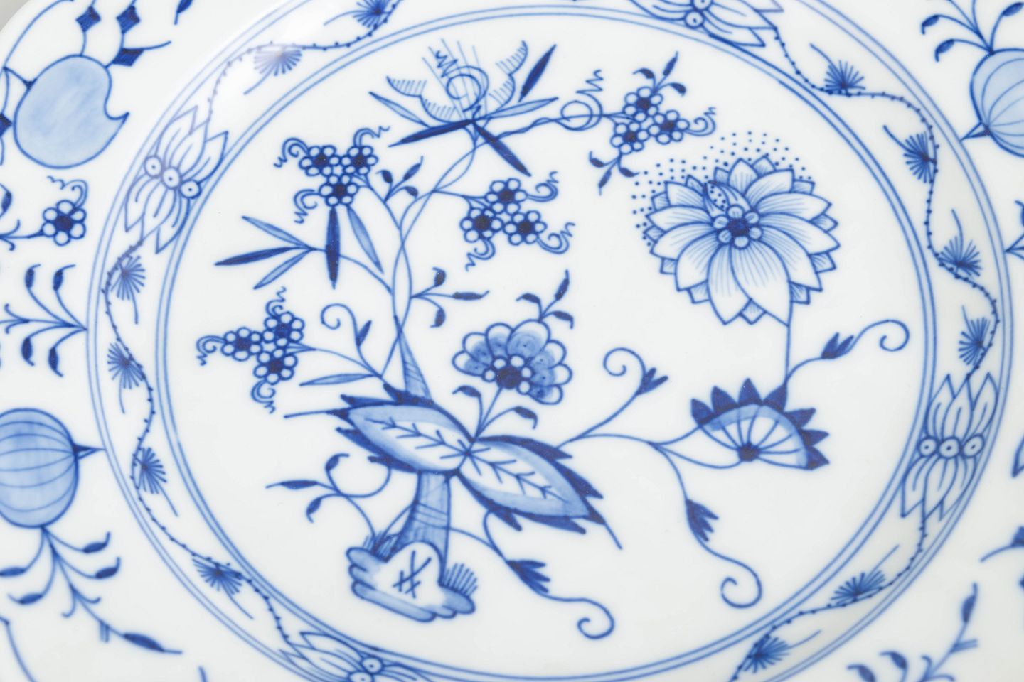 Porcelain dinner plates decorated with the classic Blue Onion pattern. Some first factory quality and some cancelled with two incised lines. Marked to the base with the Meissen crossed swords.