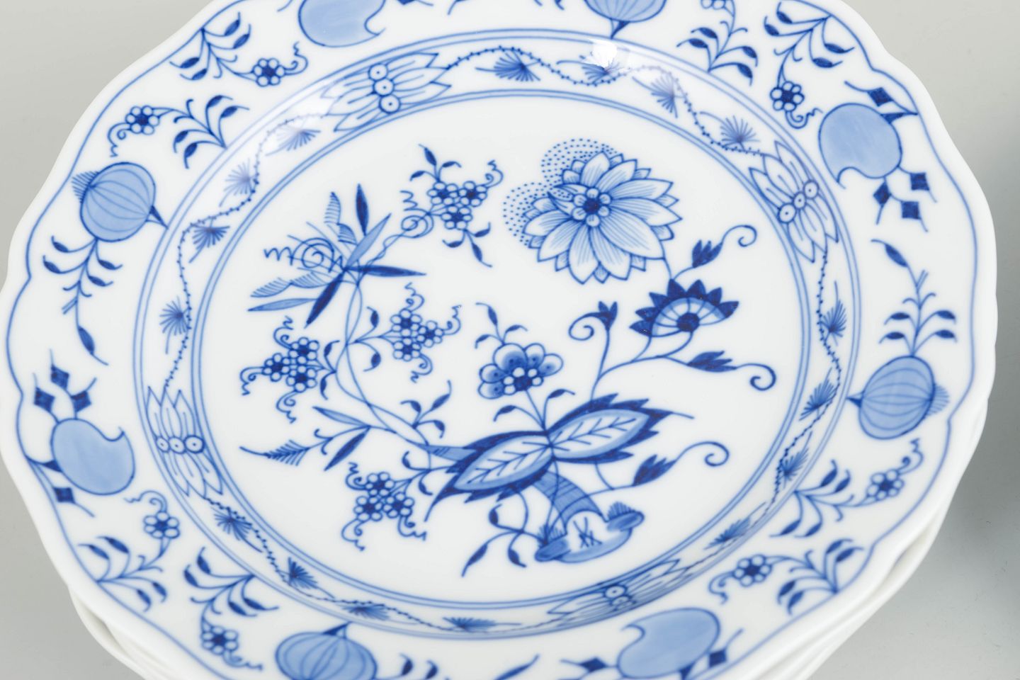 Round porcelain plates decorated with the classic Blue Onion pattern. First factory quality, marked to the base with the Meissen crossed swords.