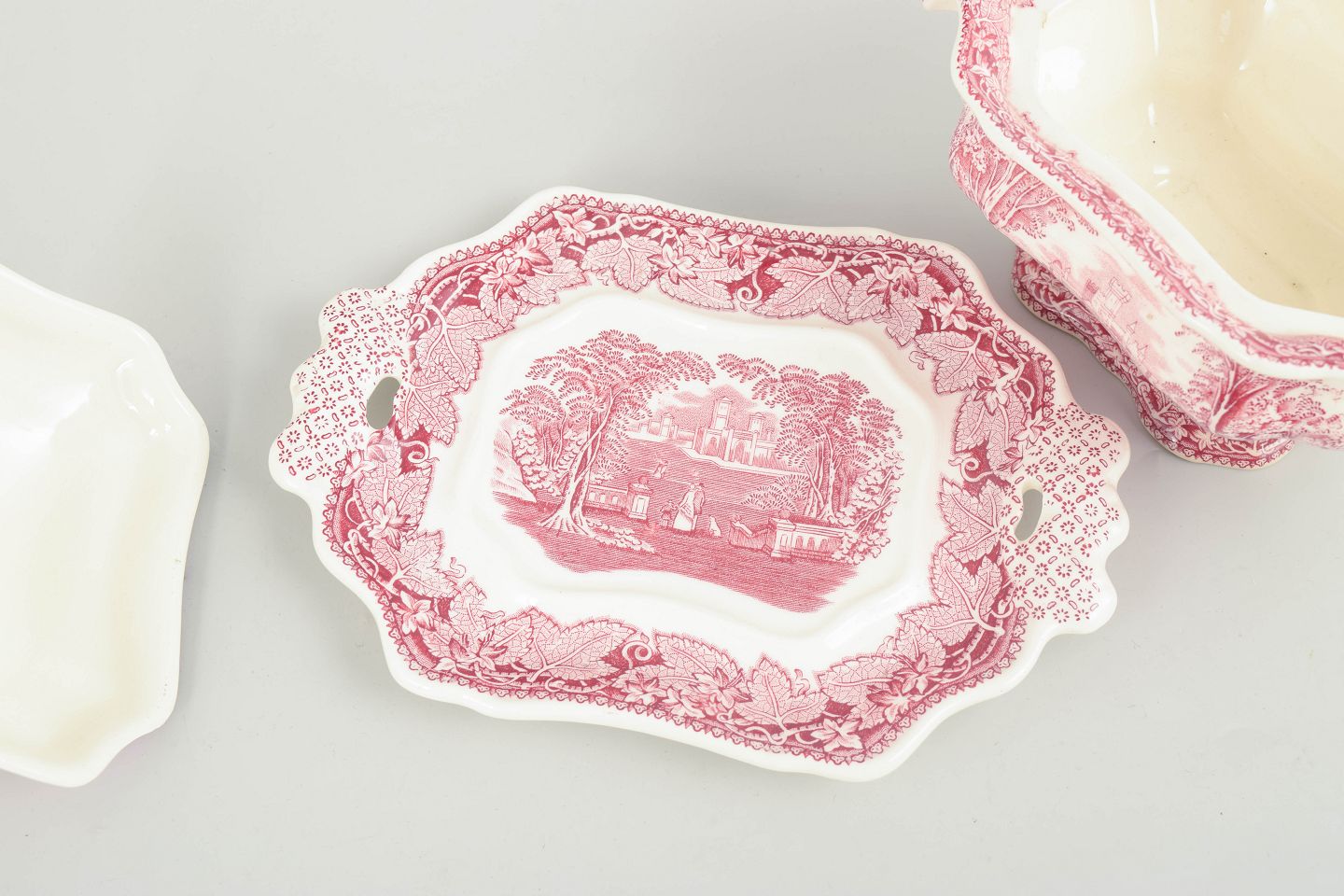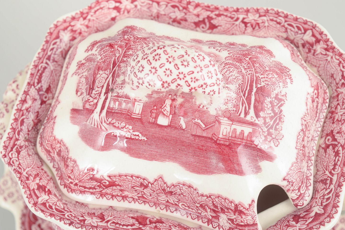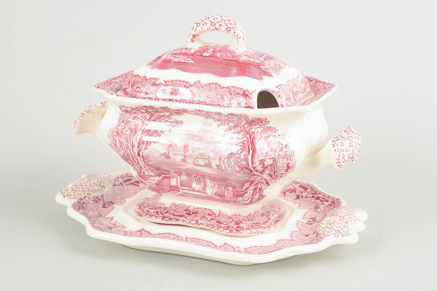 Faience sauceboat by Mason’s, decorated in red transferware with landscape motifs and ornamental borders.