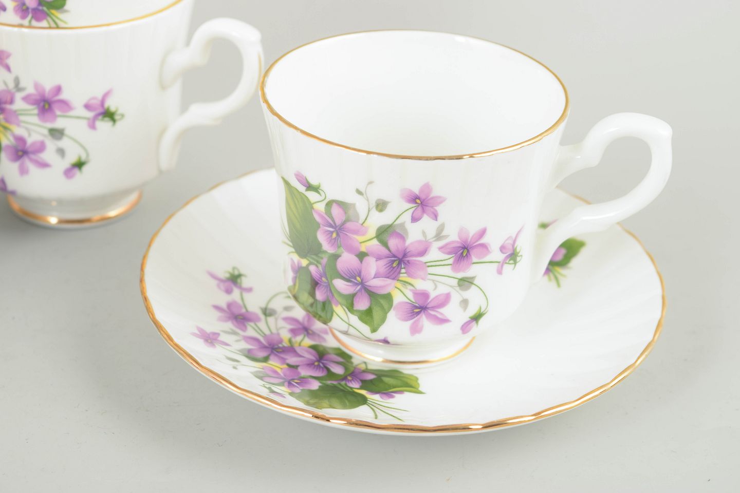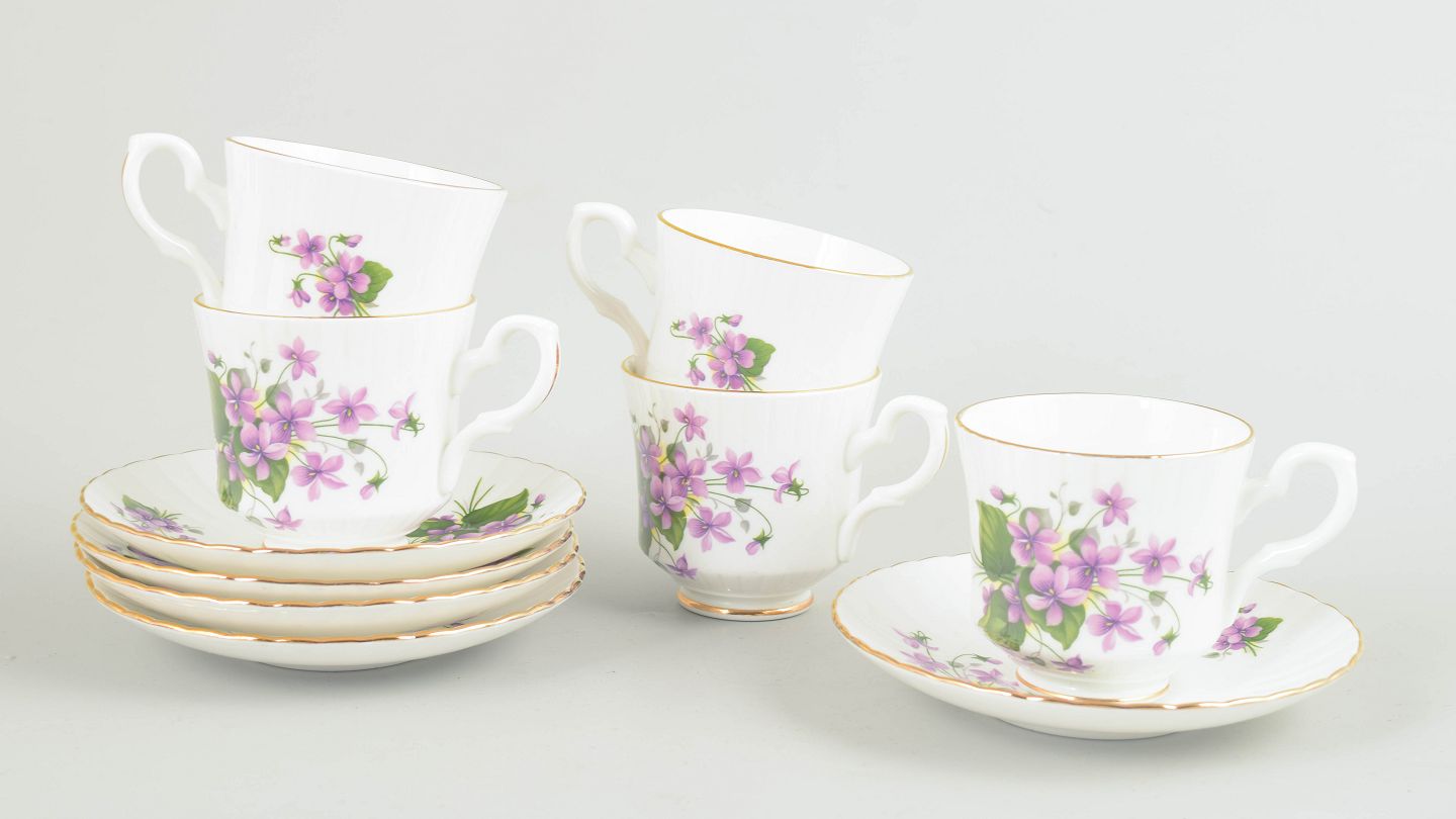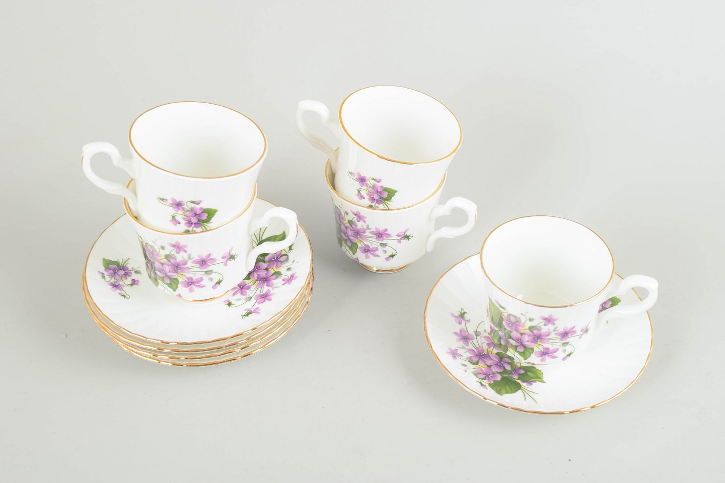 Set of five coffee cups with matching saucers in bone china, decorated with purple flowers, green foliage and gilt rims.