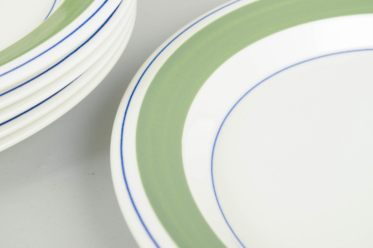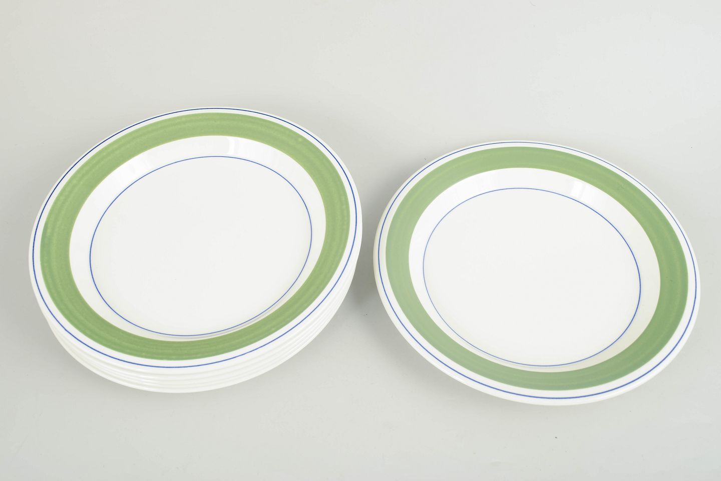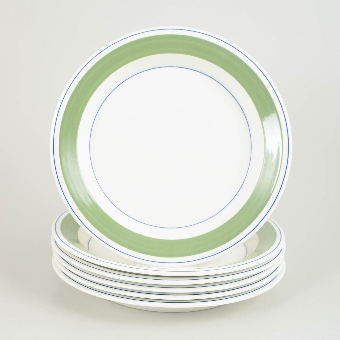 Set of 6 dinner plates decorated with the characteristic “Krokus” pattern in green tones with fine blue circular lines placed along the rim.