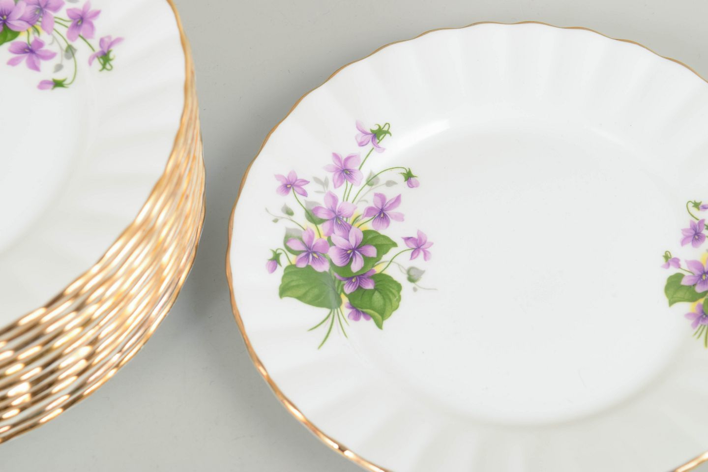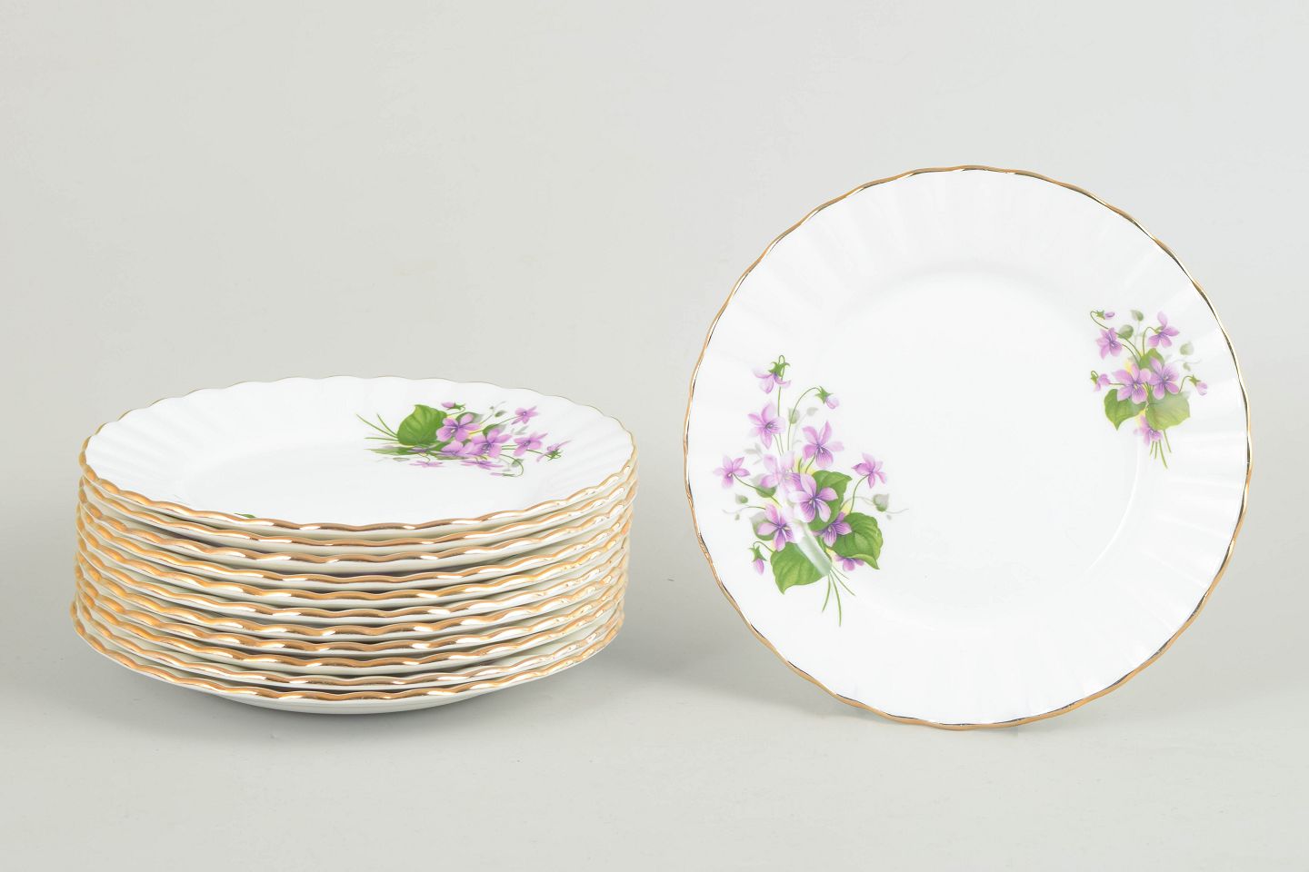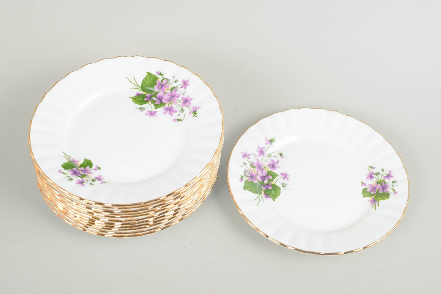 Set of twelve bone china cake plates decorated with delicate purple floral bouquets and a gilt rim. Classic English tableware with a light relief and an elegant mid-century character.