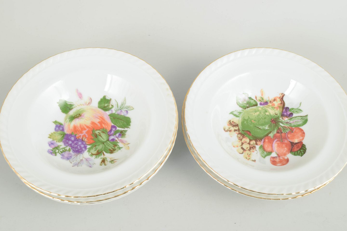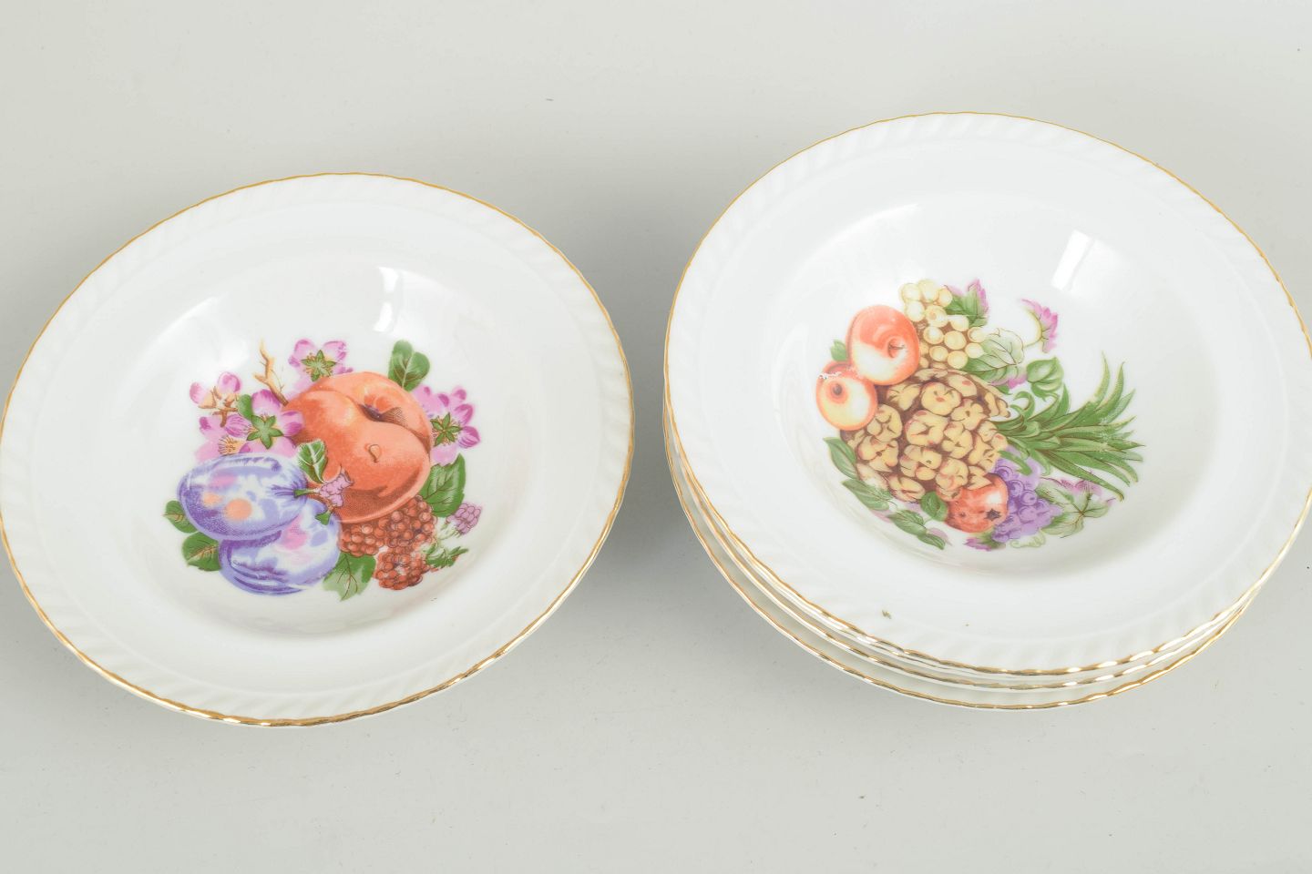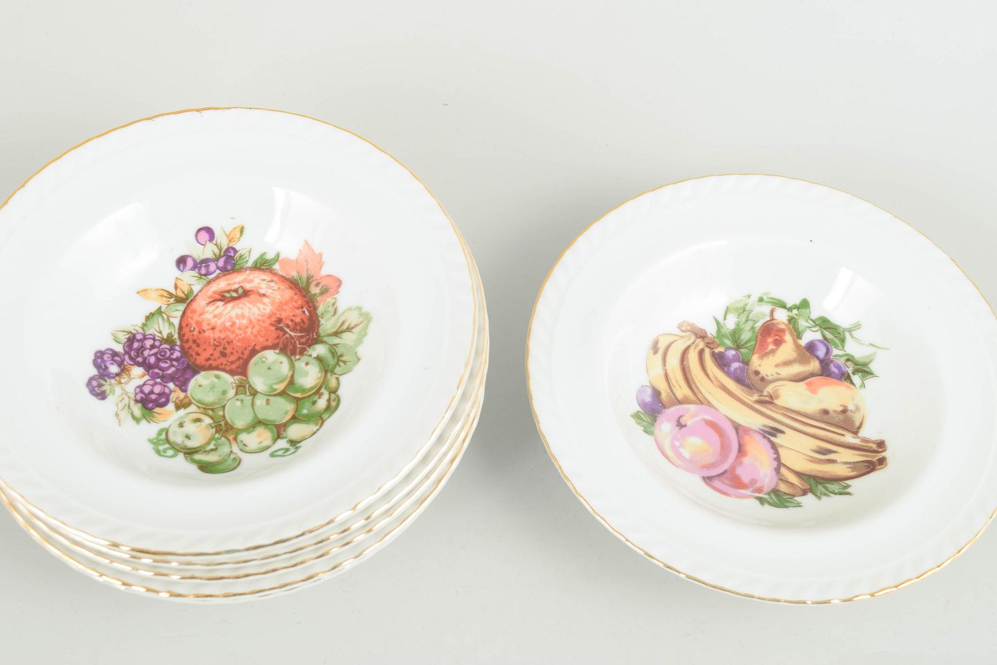 Set of six porcelain bowls decorated with a polychrome fruit motif and a gilt rim. Classic European tableware in a characteristic interwar style. Marked to the base.
