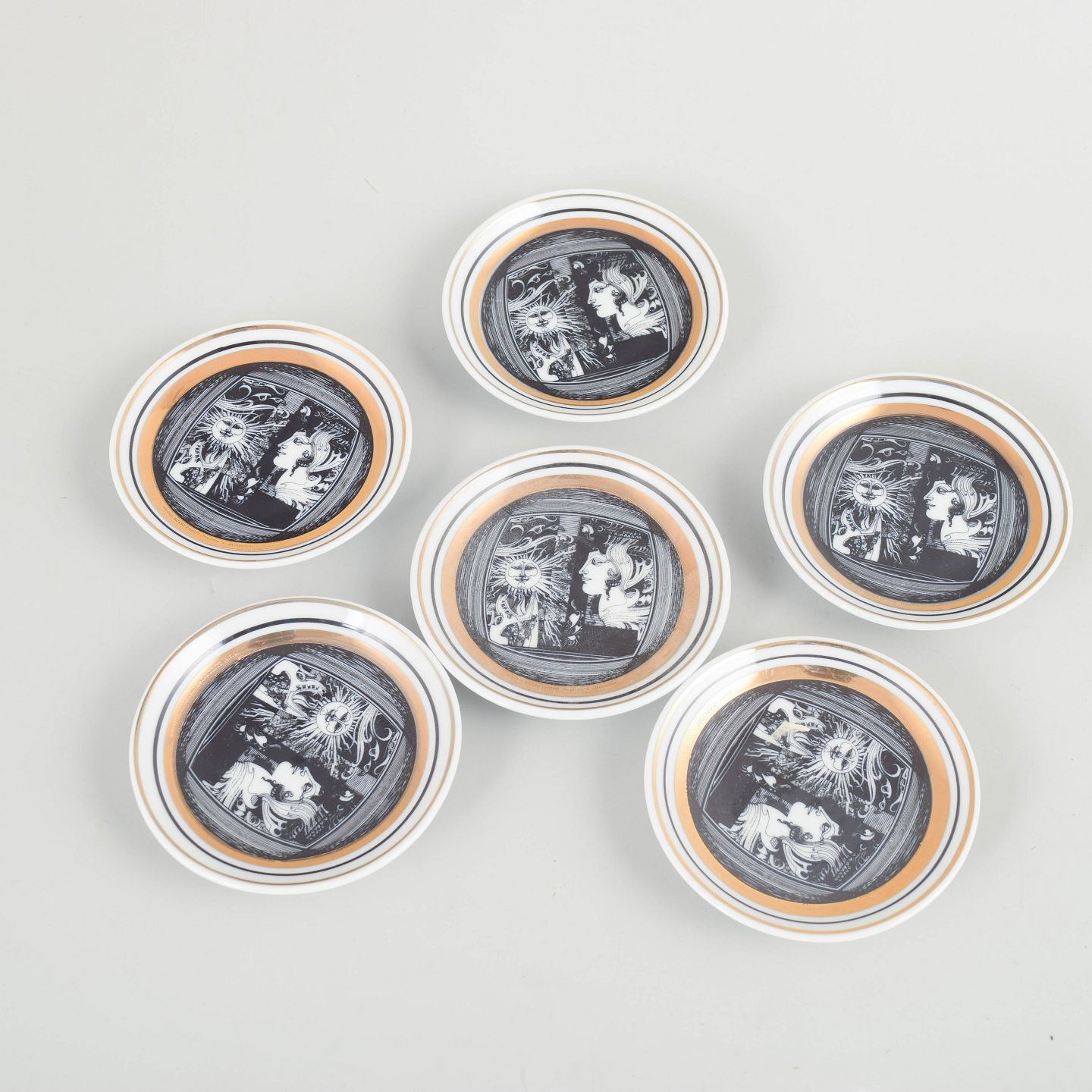 Set of six round porcelain coasters with black and white graphic decoration and gilt details. Produced as a limited edition.