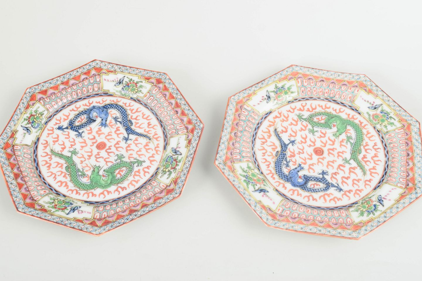 Octagonal porcelain plates, hand-painted with polychrome decoration featuring dragons and stylised motifs in iron-red, green and blue tones, framed by geometric and floral borders. Made for the export market.