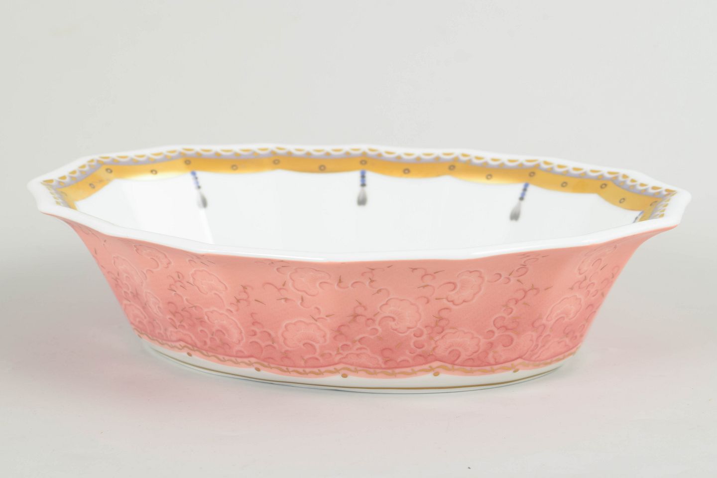 Low bowl in white porcelain decorated with the Fairytale pattern in soft pink tones with delicate ornamental detailing. Produced between 1992 and 1999 in first factory quality. Model 579.